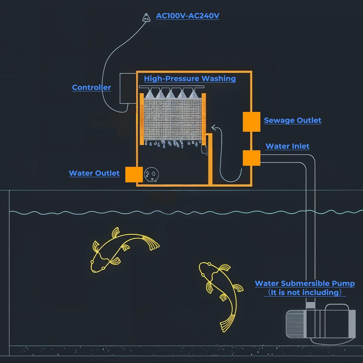 - Simply Installation:Place the rotary drum filter in the position and adjust the horizontal position,then connect the inlet pipe,outlet pipe,and sewage pipe, It is best to use the inlet pipe with a submersible water pump(1500GPH+)
