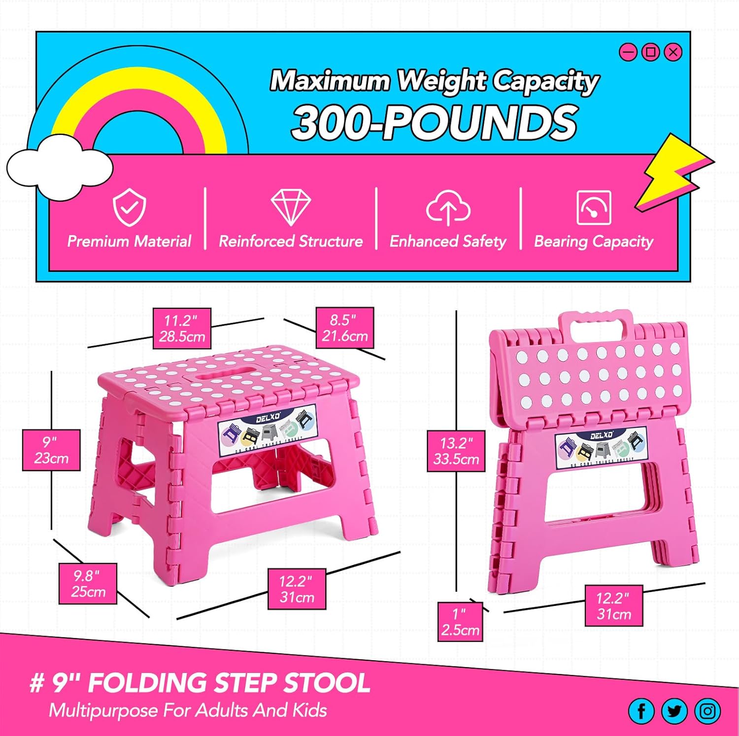 - Sturdy & Safe Foldable Step Stool : Our 9" folding step stool is handy to have around for all sorts of occasions. Compact at 9"H ×12.5"L×8.5"W when opened and 13.5"H×12.5"L×1"W when folded, this durable and strong plastic step stool can support up to 300lbs. It is lightweight and versatile, and can be used both outdoors and indoors in the kitchen, bathroom or office