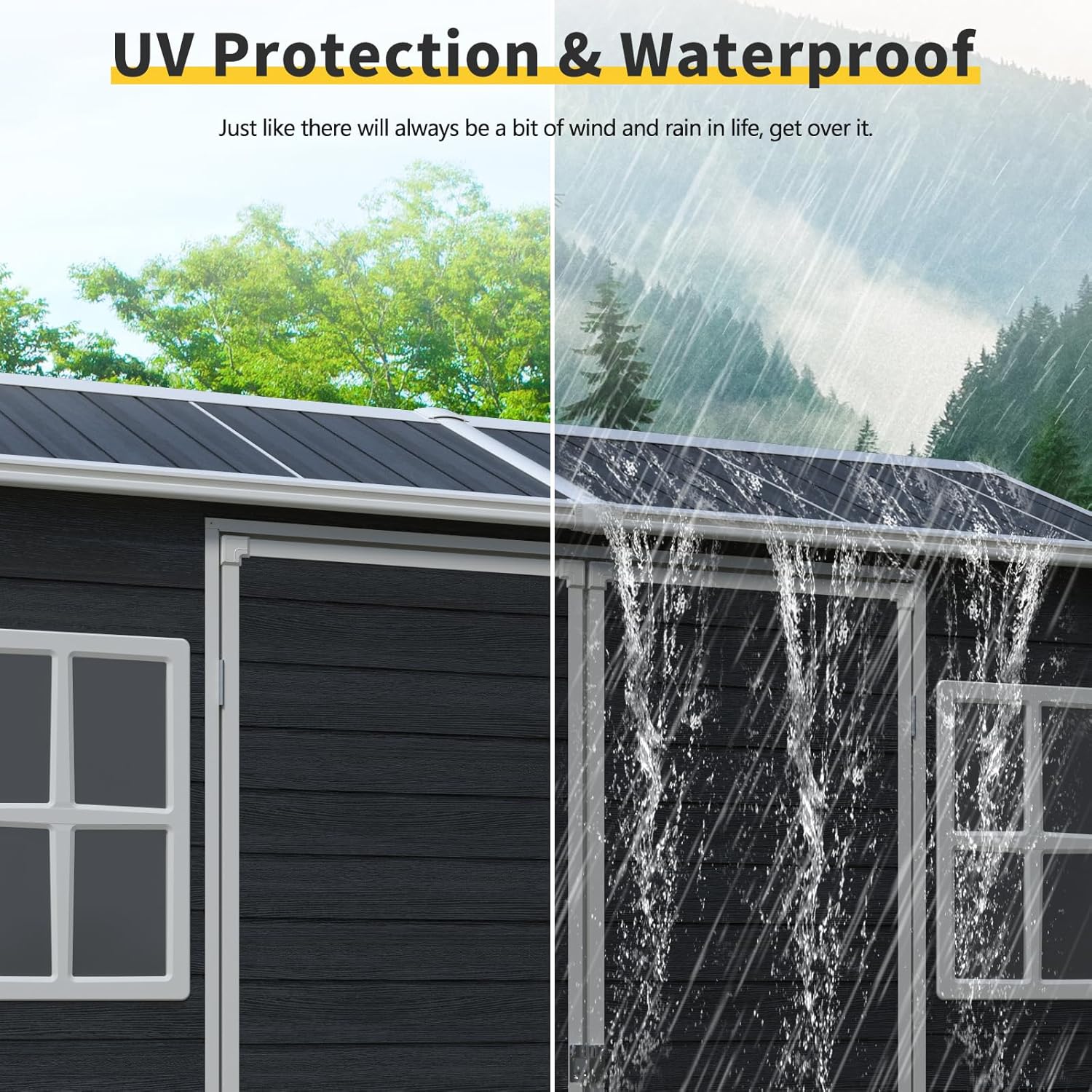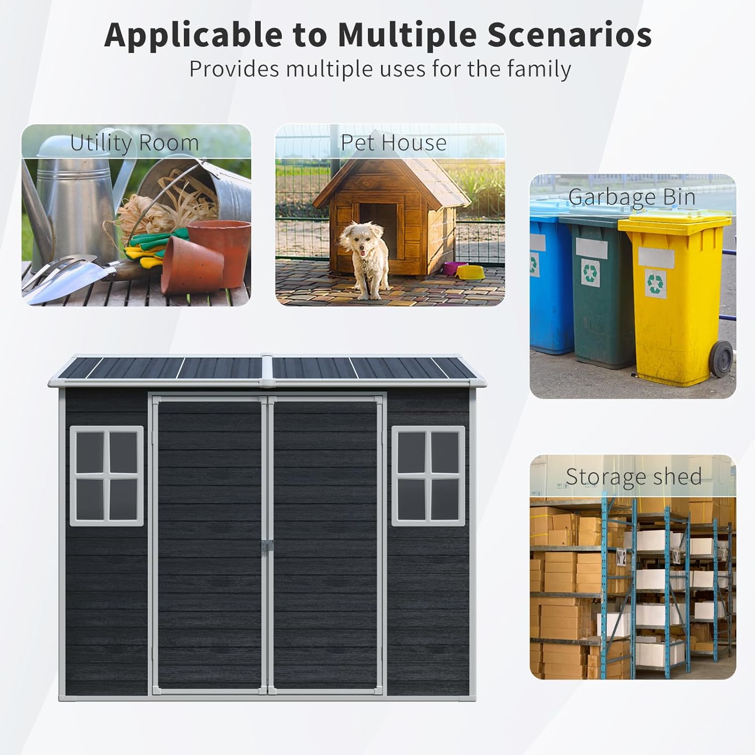 - 🏠 Durable & Weather-Resistant Construction: Crafted from premium resin materials, this 8x4 ft outdoor resin storage shed offers outstanding durability and weather resistance. Its UV-resistant surface prevents fading from sun exposure, ensuring vibrant color and long-lasting performance. Perfect for storing garden tools, patio furniture, and outdoor equipment year-round.