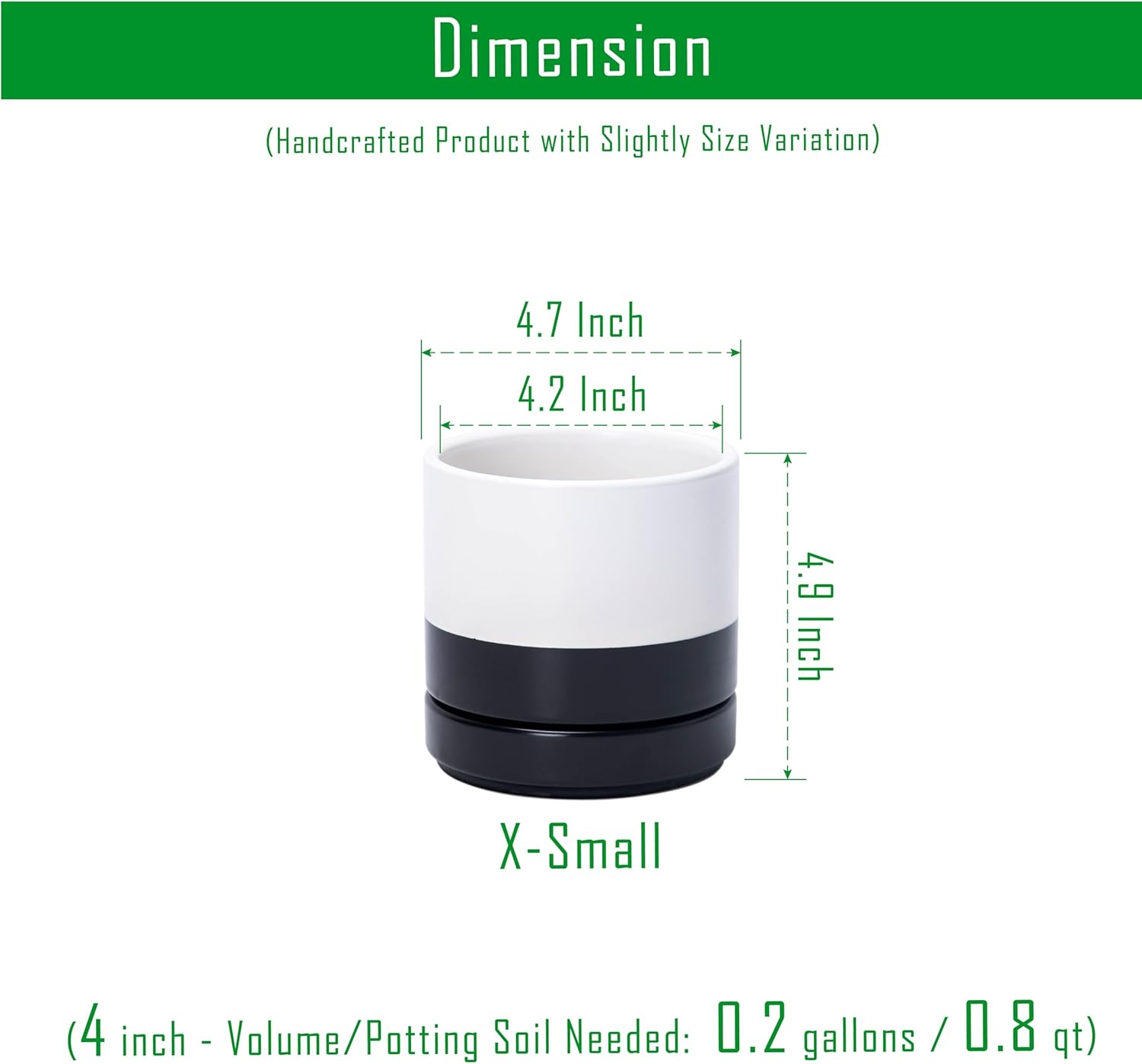 - Multiple Size Options: Available in six sizes (3.5" to 11.8") to fit plants of all types, from small succulents to larger houseplants. X-Small 4.7 Inch Planter Pot: 4.7" Diameter x 4.9" H, Potting Soil Needed: 0.2 gallons / 0.8 qt.