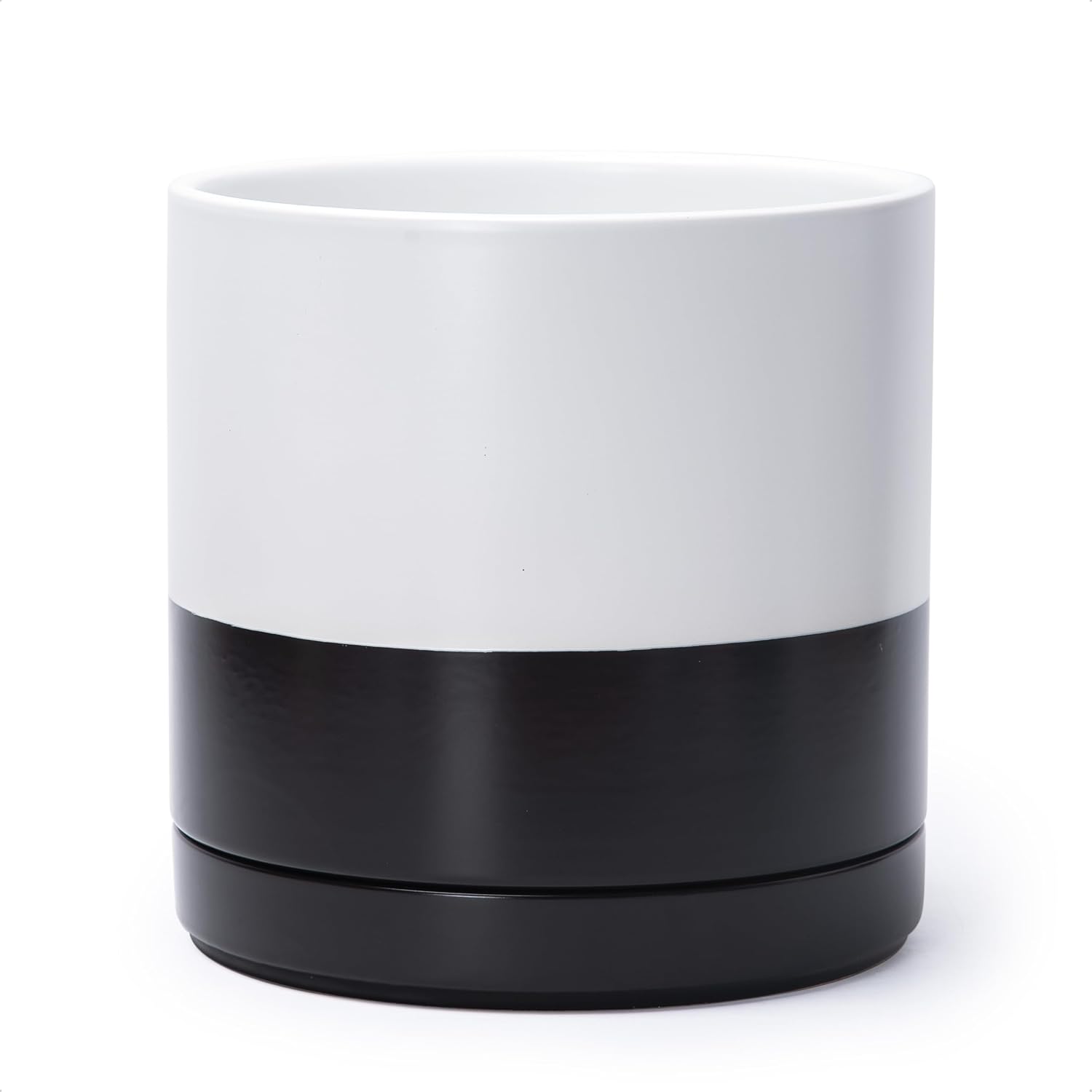 D'vine Dev 10 Inch Ceramic Planter Pot with Drainage Hole and Saucer, Indoor Cylinder Round Planter Pot, Layered Monochrome Black & White, 94-O-E-L