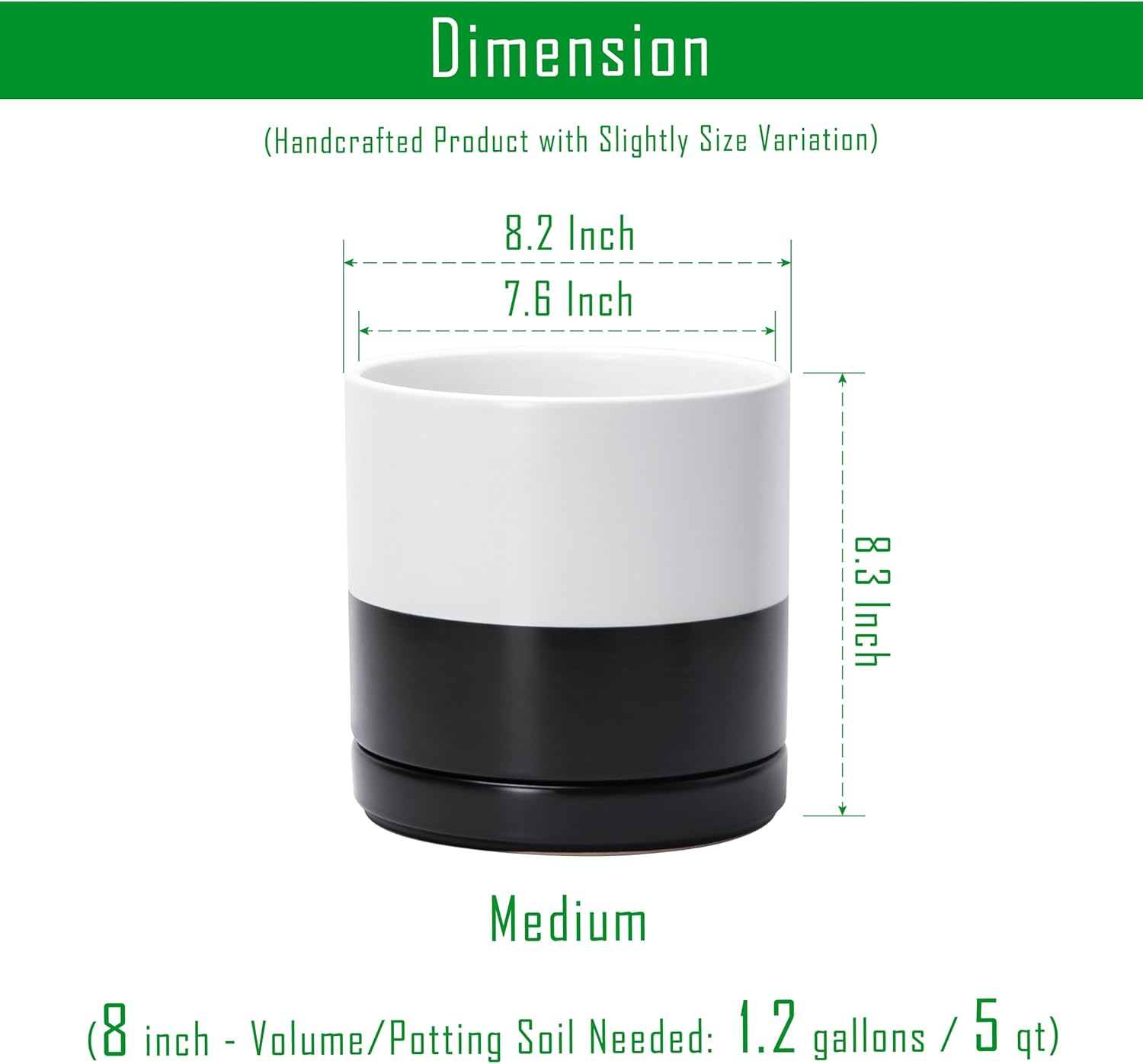 - Multiple Size Options: Available in six sizes (3.5" to 11.8") to fit plants of all types, from small succulents to larger houseplants. Medium 8 Inch Planter Pot: 8.2" Diameter x 8.3" H, Potting Soil Needed: 1.2 gallons / 5 qt.