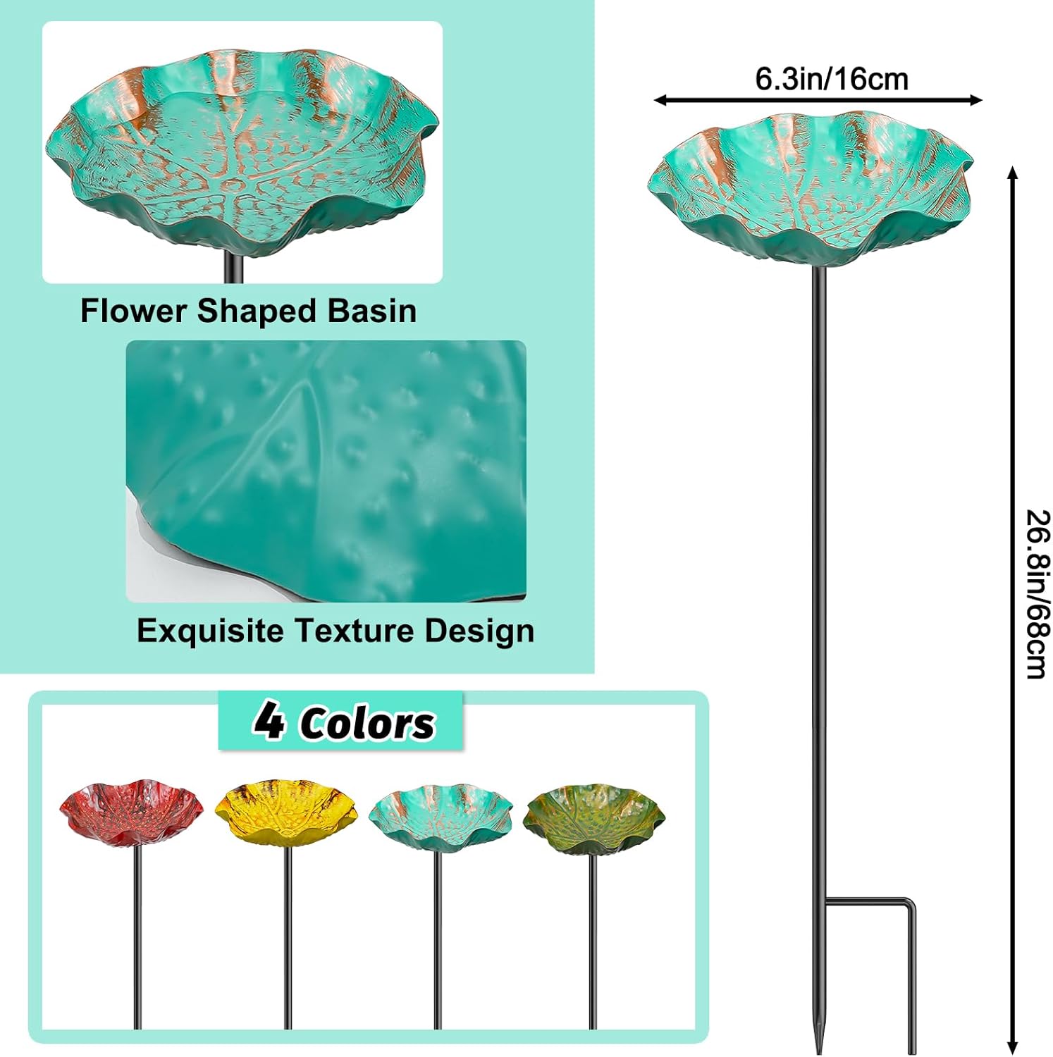 - Durable Design: The bird bath for outside is made of high quality material, waterproof, not easy to fade. The pole of the hummingbird birdbath is not easy to break, and the two sturdy tips allow the birdbath to stand firmly in the garden soil, can be used for a long time