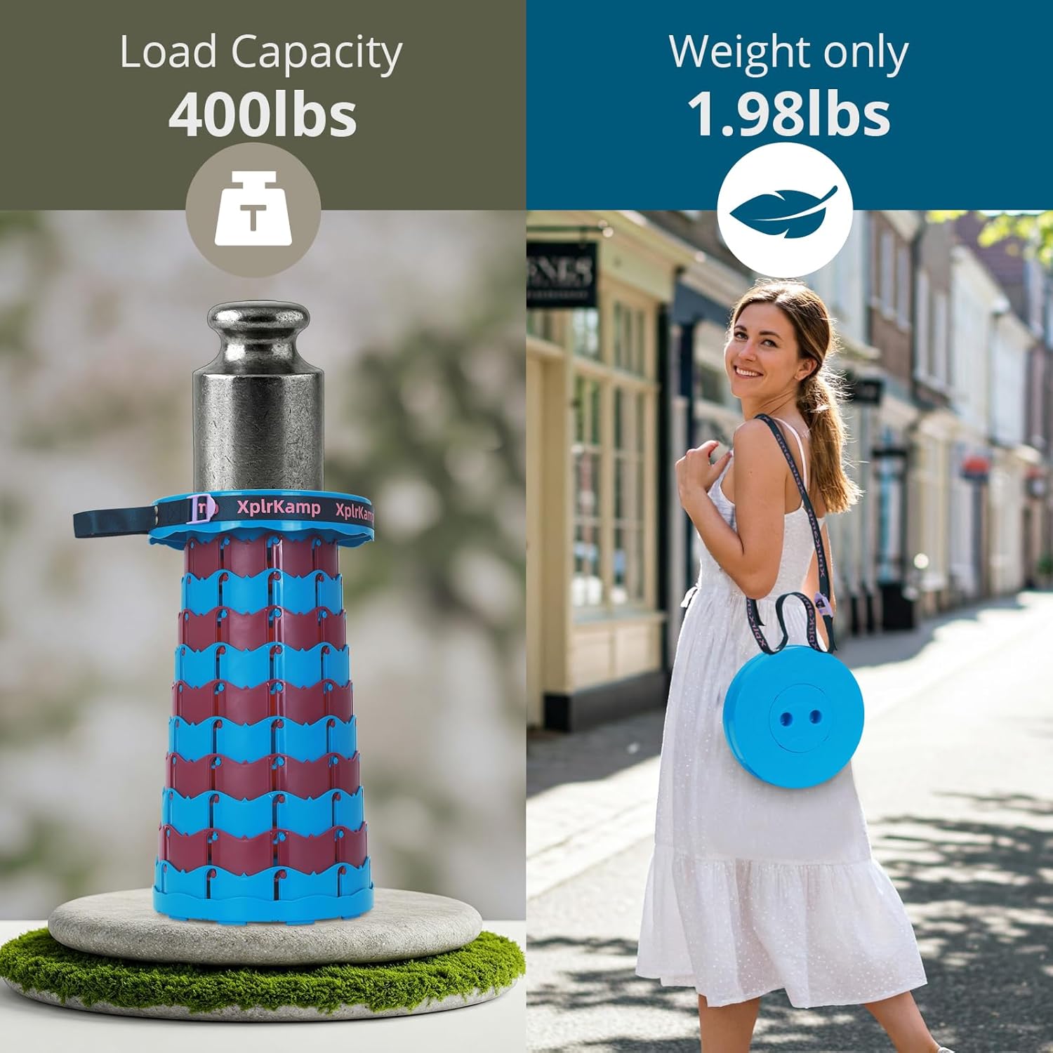 - Foldable & Portable: The XplrKamp foldable stool weighs only 1.98 lbs (0.9kg) with a collapsible size of 2.56"×9.84" (6.5×25cm).Features a 22-inch adjustable strap for shoulder carry or backpack attachment. Ideal as a camping stool for hiking, fishing,outdoor painting and picnics, while fitting seamlessly in cars, closets, or small spaces