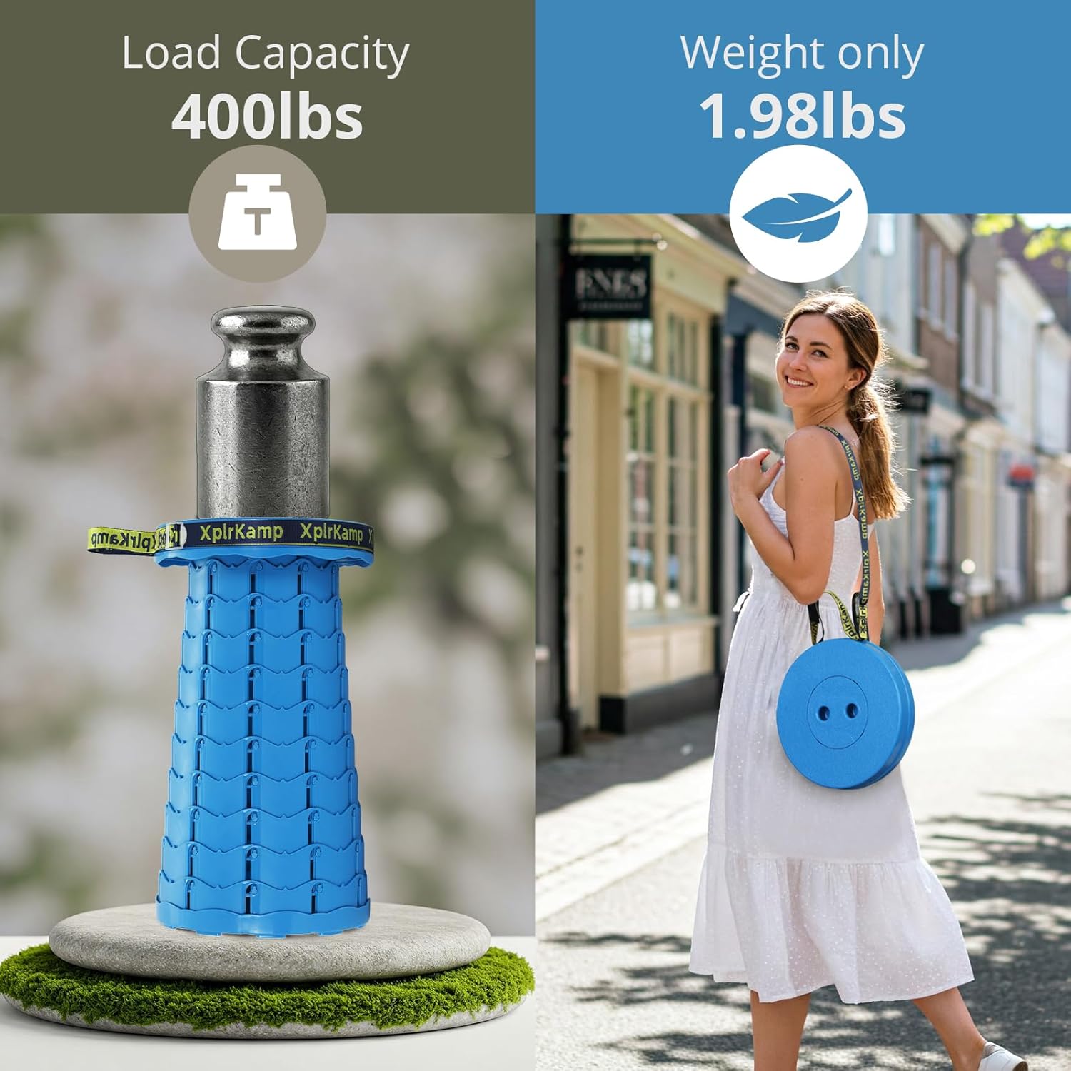 - Foldable & Portable: The XplrKamp foldable stool weighs only 1.98 lbs (0.9kg) with a collapsible size of 2.56"×9.84" (6.5×25cm).Features a 22-inch adjustable strap for shoulder carry or backpack attachment. Ideal as a camping stool for hiking, fishing,outdoor painting and picnics, while fitting seamlessly in cars, closets, or small spaces