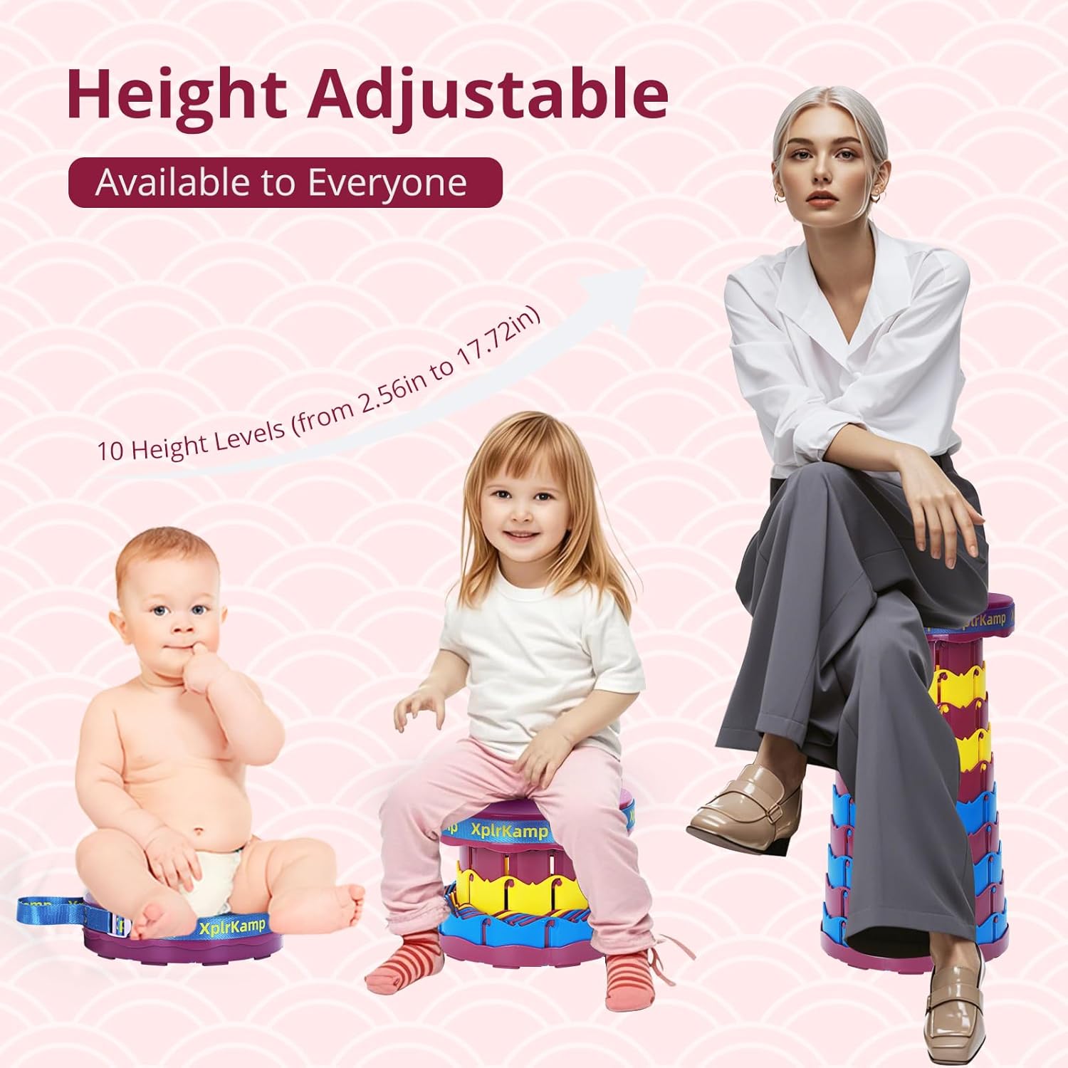 - Height Adjustable: The height adjustment range of the telescopic stool is from 2.56 inches to 17.72 inches. With 10 settings, the retractable stool adapts to various activities and user preferences, being a wonderful collapsible camping stool for adults and children