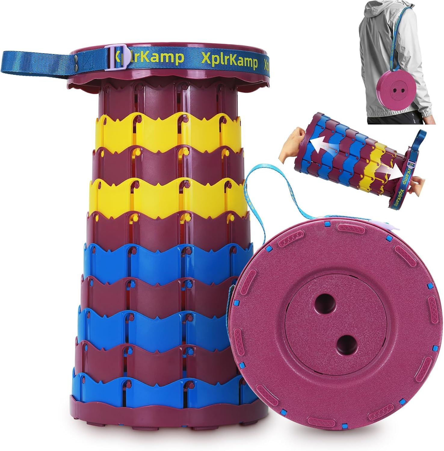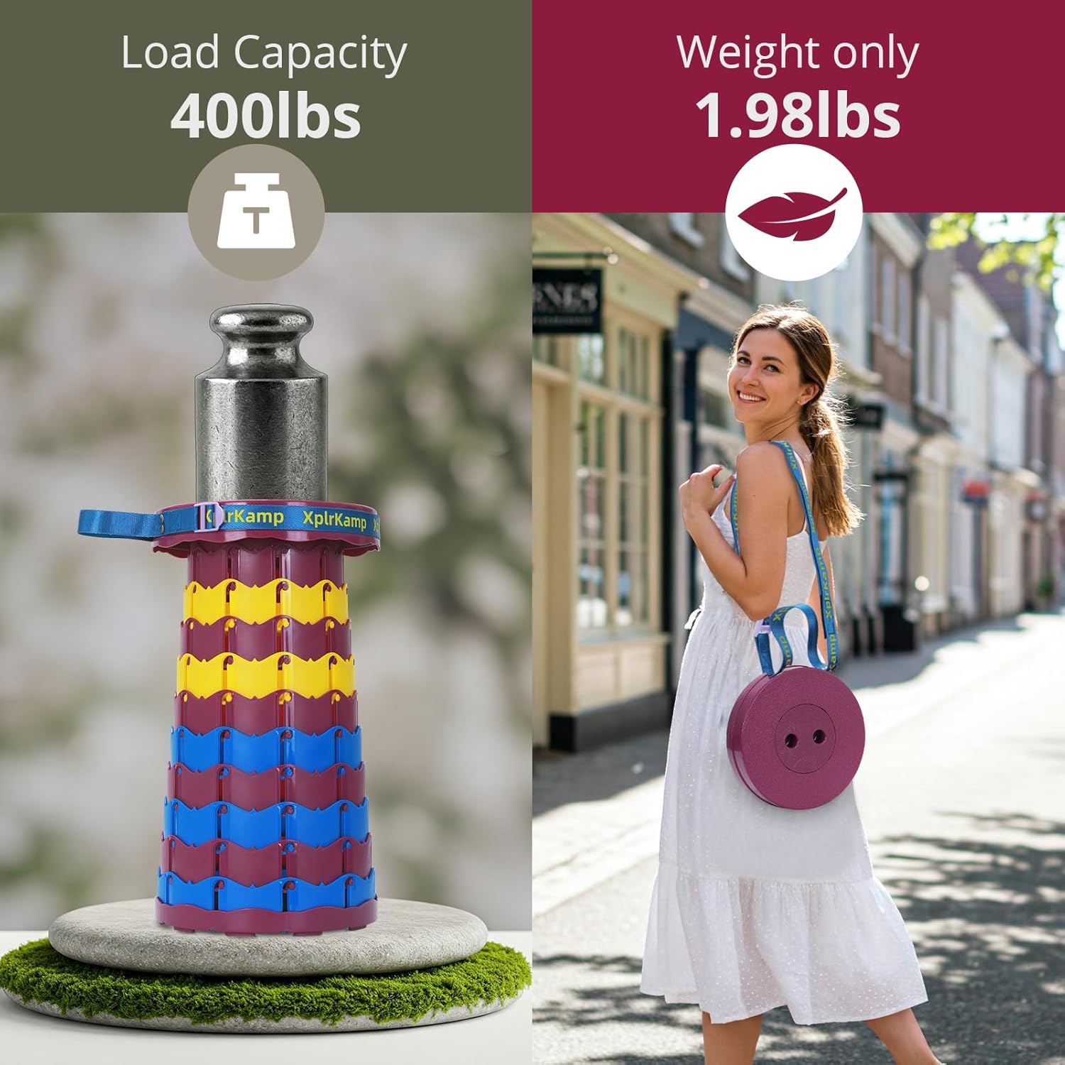 - Foldable & Portable:The XplrKamp foldable stool weighs only 1.98 lbs (0.9kg) with a collapsible size of 2.56"×9.84" (6.5×25cm).Features a 22-inch adjustable strap for shoulder carry or backpack attachment. Ideal as a camping stool for hiking, fishing,outdoor painting and picnics, while fitting seamlessly in cars, closets, or small spaces