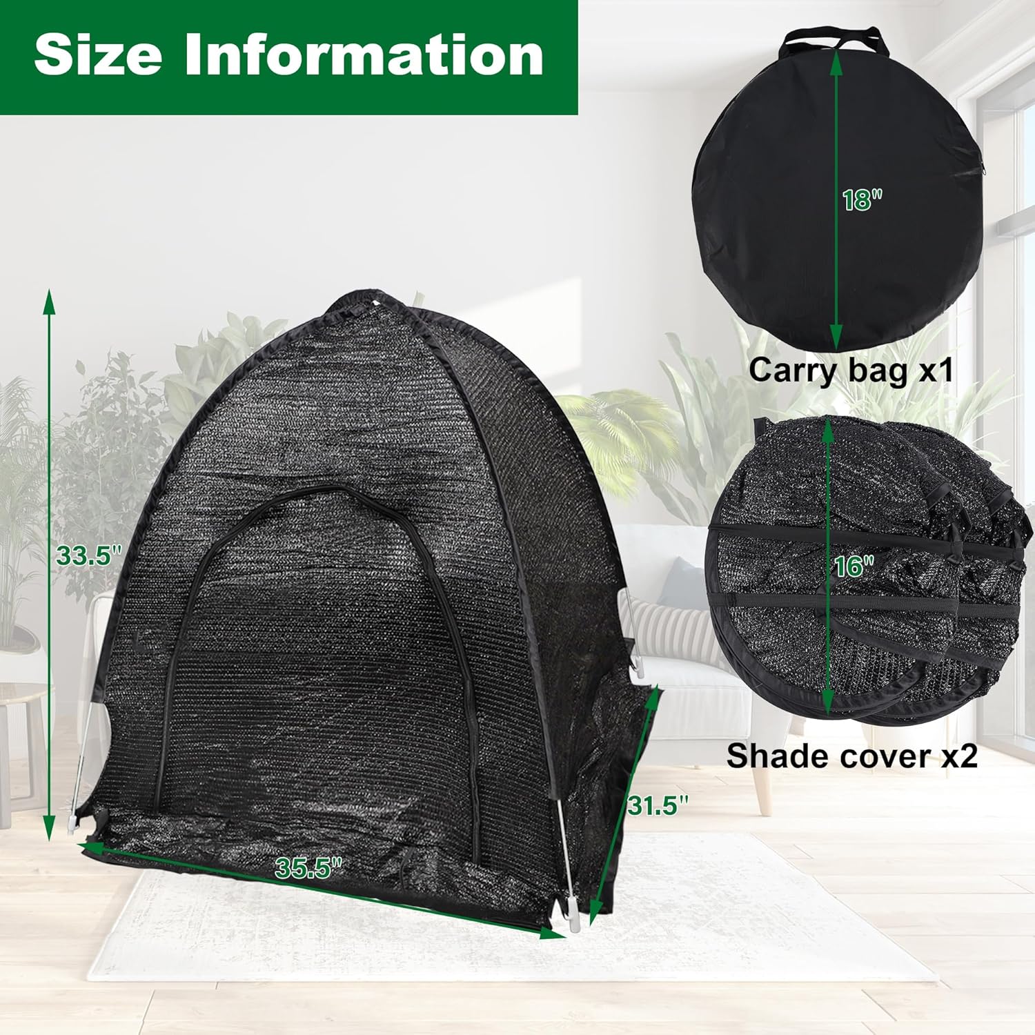 - Lightweight, Portable & Easy Installation: Your will get a carry bag and two shade covers. With a pop-up design (please be careful when opening), this 33.5x35.5x31.5 inch sunshade net requires no assembly and folds into a compact bag for easy portability, making it ideal for outdoor gardens, patios.