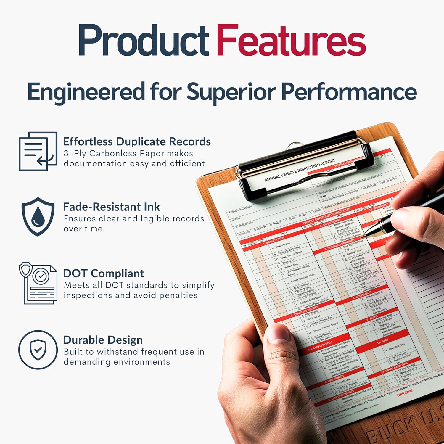 - Durable & Weatherproof: Crisp, clear copies on carbonless vehicle inspection forms paired with heat-resistant aluminum DOT inspection stickers that withstand tough trucking environments.
