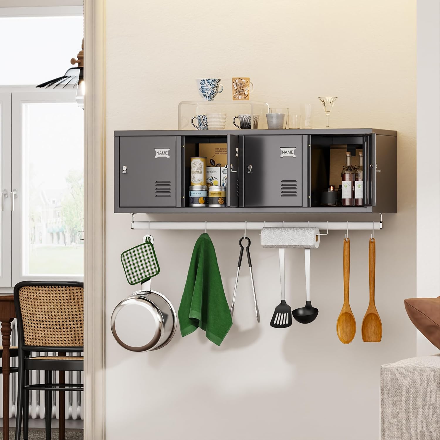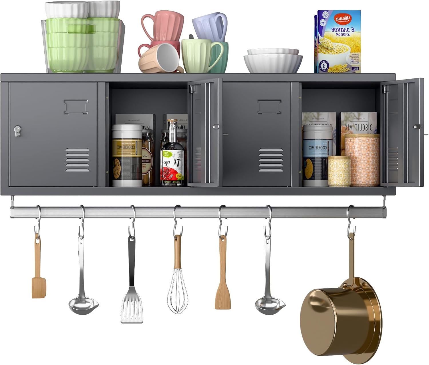 Metal 4 Doors Locker Cabinet with Hanging Rod, Wall-Mounted Storage Lockers for Home, Office, Garage, Storage, Assembly Required, Dark Gray