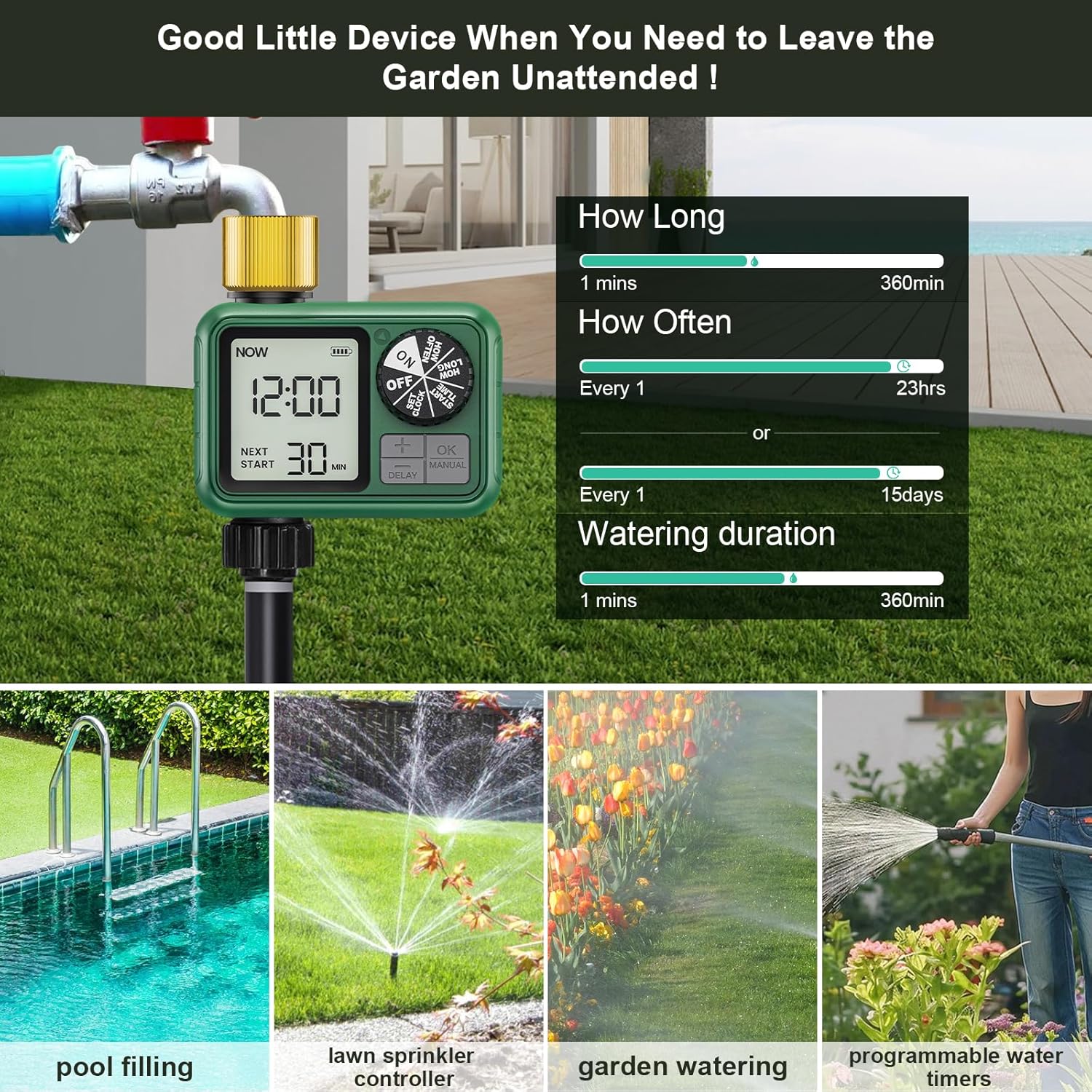 - 【EASY TO PROGRAM, LOTS OF FLEXIBILITY WITH SETTINGS】Our 2025 upgraded hose timer brass is easy to use and has a full of functions which are auto, manual, and rain delay three modes to meet all your watering needs, you are able to program it for exactly what you need it for with confidence it will water when programmed. Ideal for outdoor gravity drip irrigation, garden hose watering, lawn sprinkler controller, greenhouse mist system, pool filling, birdbath dripper, pet drinking, etc.