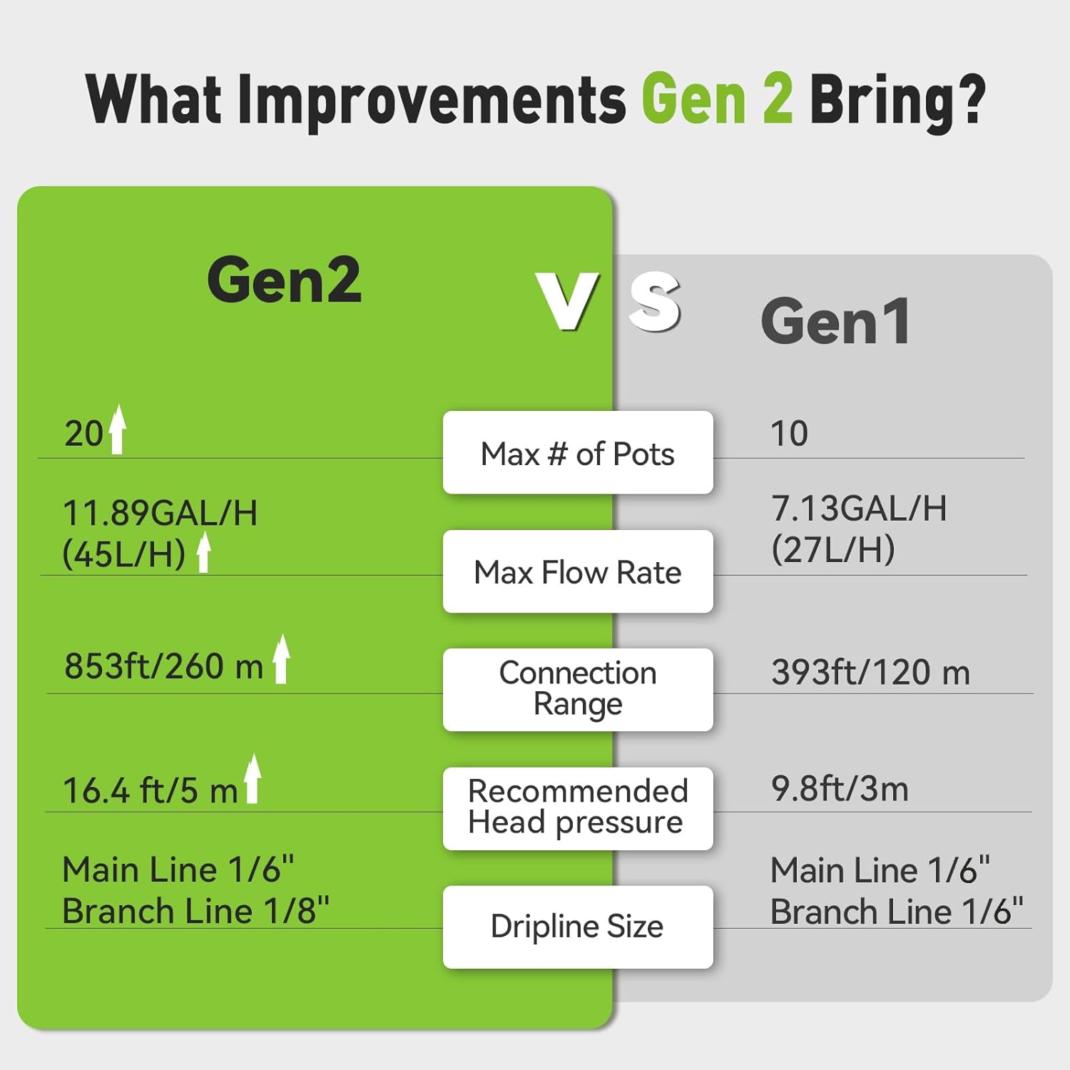 - 【🚀Higher Pumping Output】Our Gen2 WiFi waterer features a premium motor that delivers greater pump head(16.4ft/5m recommend), making it easy to nourish 20 lush plant varieties - from cascading pothos to sun-loving succulents. With it, your indoor garden will become a thriving oasis where you can sip your coffee as new leaves unfurl and time melts into your thriving oasis.