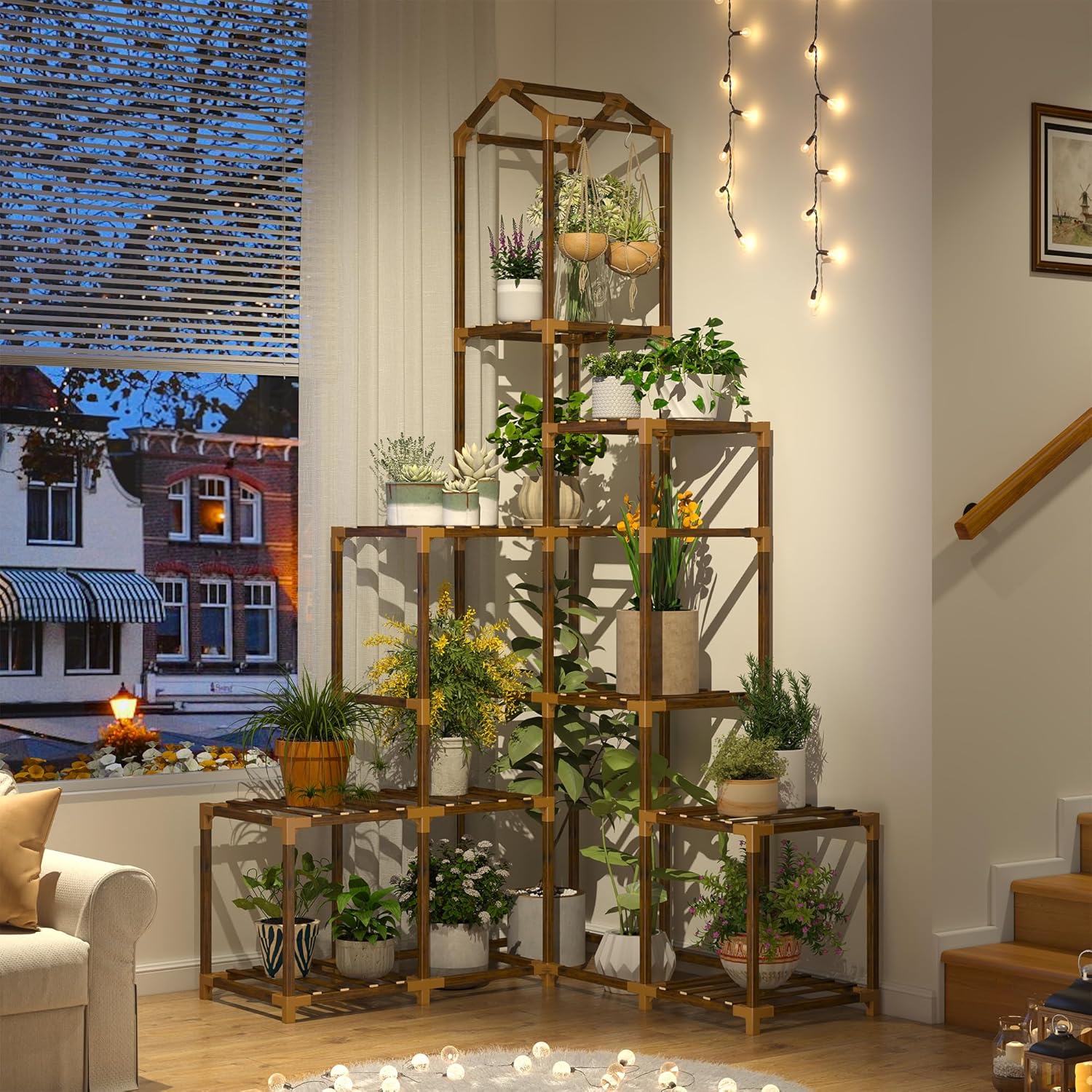 - 【Durable Carbonized Natural Wood and DIY Plant Shelves】The plant racks are made of premium wood and carbonized at high temperature, no fade, shrink, warp, crack. This process not only extends its lifespan but also ensures it remains a healthy choice, eliminating the need for extra paint or varnish, that enhances waterproof performance and extend service life for both indoor and outdoor use. You can customize the configuration, DIY to suit your preferences! Easily switch up the overall shape of the plant stand by simply changing the connections around. You can also split or connect multiple kits together to make displays that fit your space and create your indoor garden