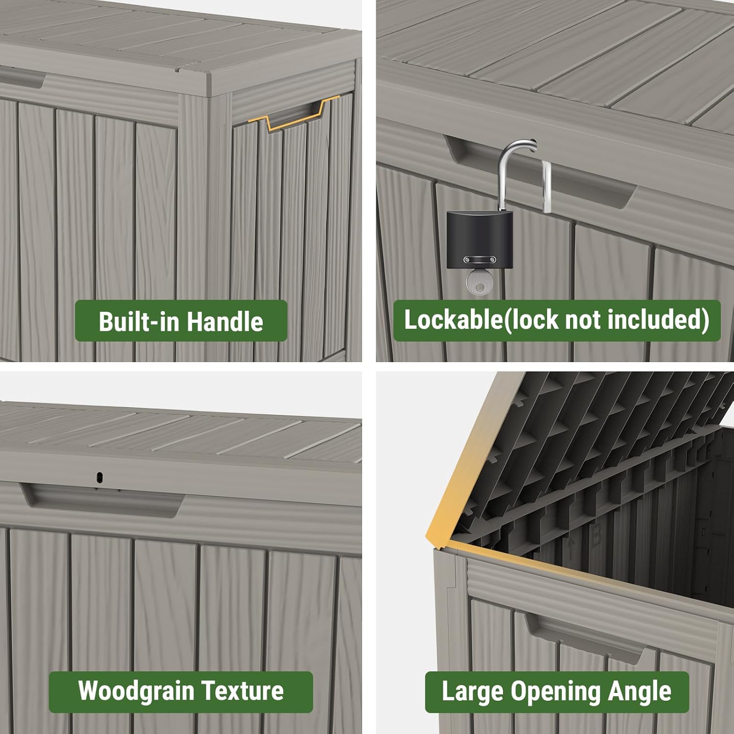 - 【Weatherproof & Durable】- Made from upgraded PP resin with a refined woodgrain finish, this deck box features a UV-resistant and waterproof surface that keep your items clean and dry year-round with minimal maintenance, ensuring long-lasting performance