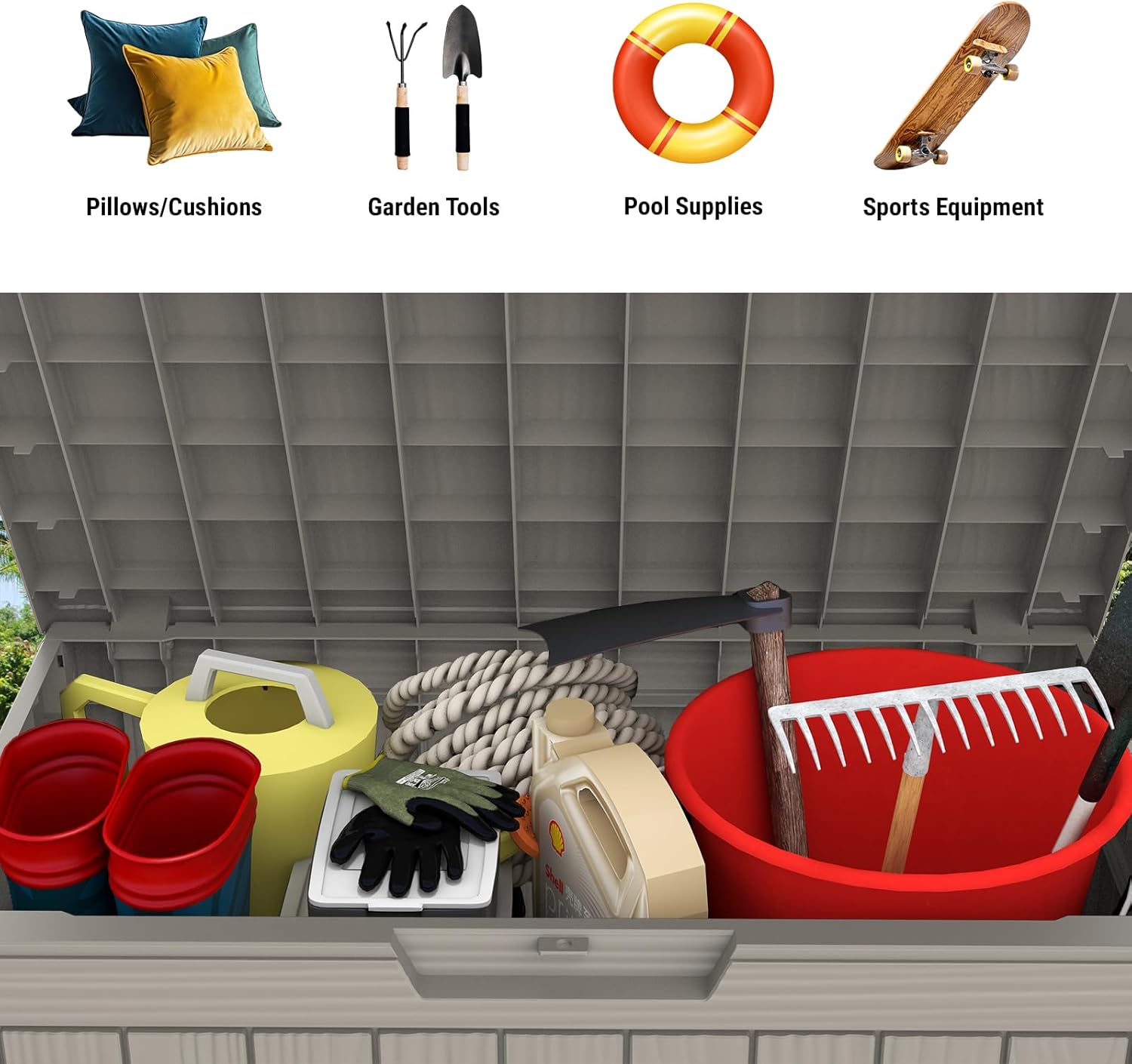 - 【Versatile Storage Solution】- Keep your outdoor area neat and organized with this versatile deck box, perfect for storing patio couch or lounge chair cushions, pool accessories like towels and cleaning supplies. Use it to store gardening tools or as a safe spot for porch deliveries, even doubles as a small side table