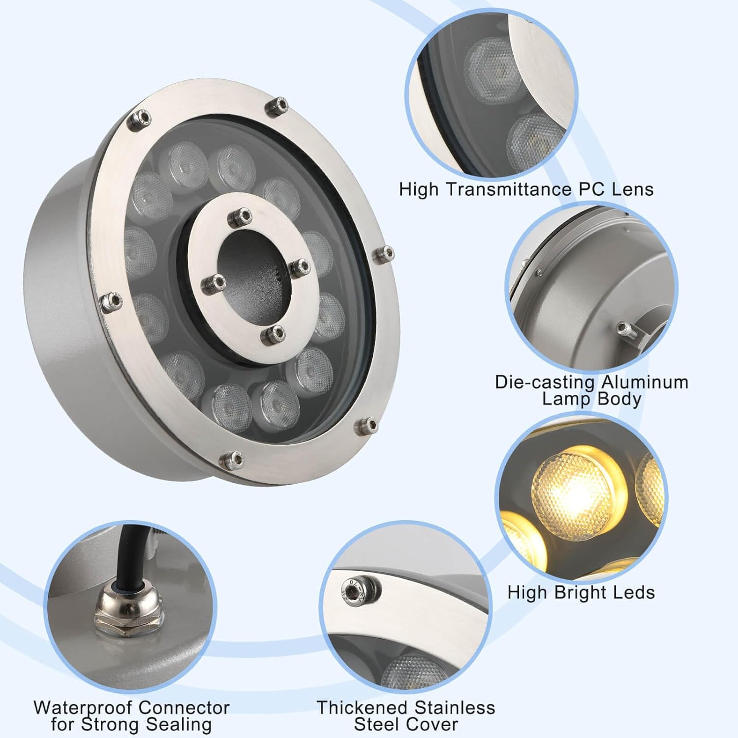 - Bright 1320 Lumen Warm White Lighting:Powerful 12W LED fountain lights emit a cozy 3000K warm white glow (1320 lumens) to highlight ponds, fountains, or garden waterfalls, enhancing nighttime ambiance.