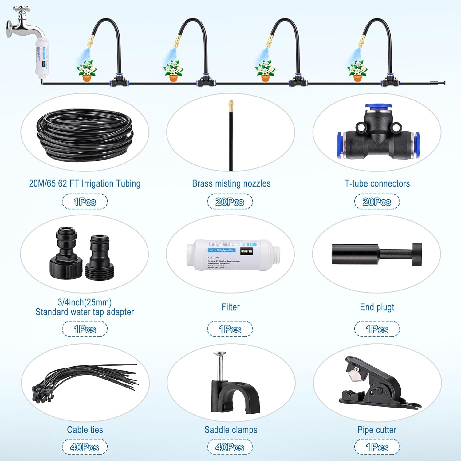 - 【Package】: Mornajina drip irrigation system kit comes with 9 kinds of accessories, including ① 1 x Calcium Inhibitor Filter; ② 1 x 66FT 5/16 inch Irrigation Tubing Hose, 6mm/0.24inch ID & 8mm/0.31inch OD; ③ 20 x 8.3 inch 360-degree Bendable Support Rod with Brass Mist Nozzle; ④ 20 x Misting Nozzles Tees; ⑤ 1 x 3/4 inch (25mm) Faucet Adapter (One side connected to 3/4 inch (25mm) Standard water tap, and the other side connected to 8mm tubing pipe); ⑥ 40 x Cable Ties; ⑦ 40 x Saddle Clamps; ⑧1 x End Plug; ⑨ 1 x Pipe Cutter. They are perfect for a comprehensive irrigation system.