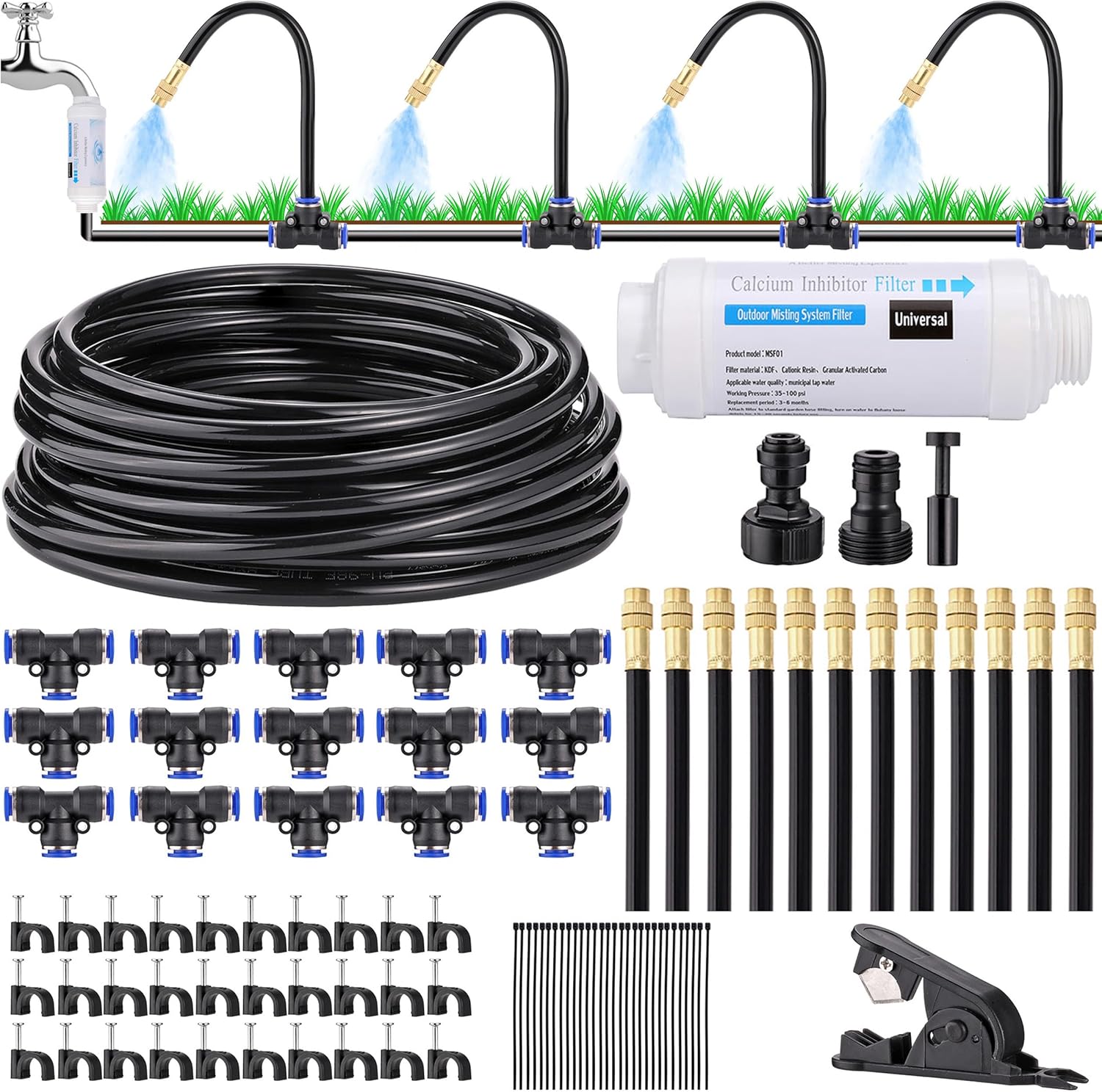 Mornajina Automatic Drip Irrigation Kits Garden Irrigation System, Includes Calcium Inhibitor Filter & 66FT 5/16 inch Irrigation Tubing Hose & 20Pcs 360° Bending Dropper Atomizing Mist Nozzles Tee