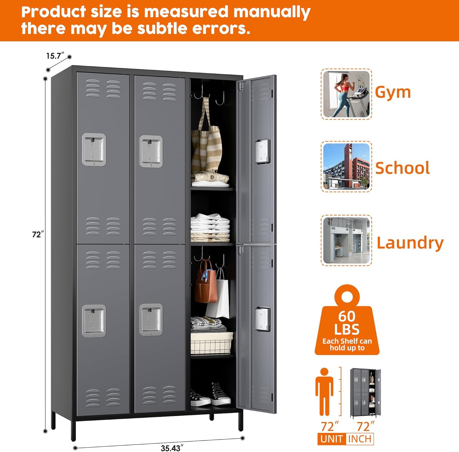 6 Doors Metal Lockers for Employees with 18 Hooks for Offices School Gyms Home,Assembly Required,Black and Dark Gray