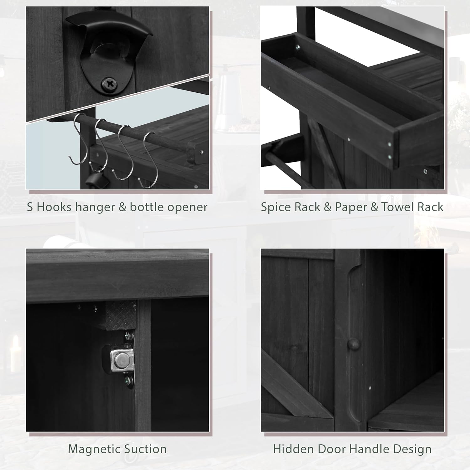 - Versatile Functionality: Equipped with a sturdy spice rack, paper towel rack, 4 S-hook hangers, and a bottle opener, this outdoor grill cart ensures you have all your essentials within reach. Its versatile design makes it the perfect solution for organizing and maximizing your outdoor culinary space.