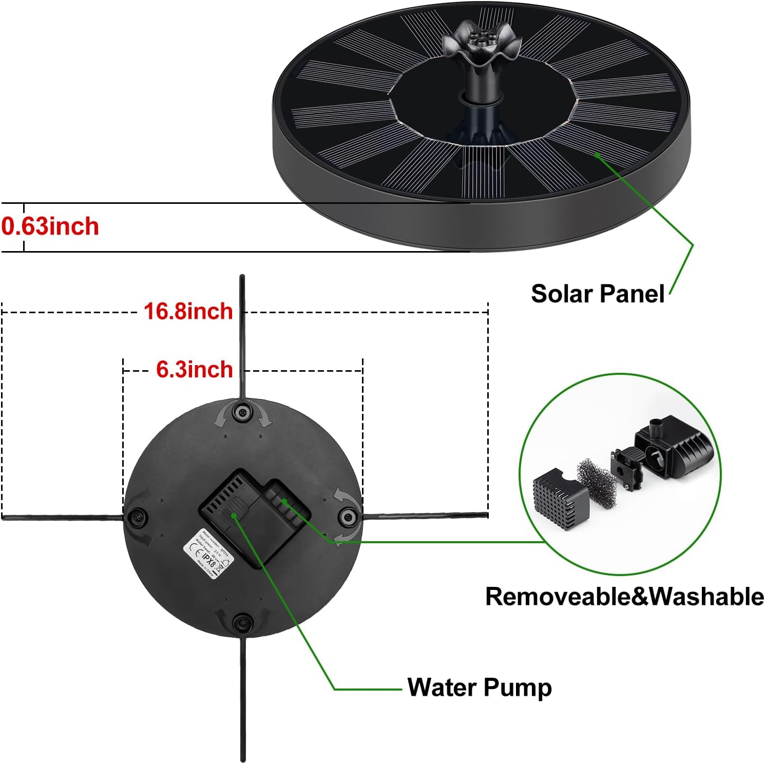 - ALL IN ONE FIXED RODS - Still worried about the complicated installation process? We have considered and solved this problem for you, now you only need to adjust the angle of the four fixing rods according to the size of the birdbath to fix the solar powered fountain in the middle of the bird bath, we recommend using a birdbath with a diameter of 21 inches or large