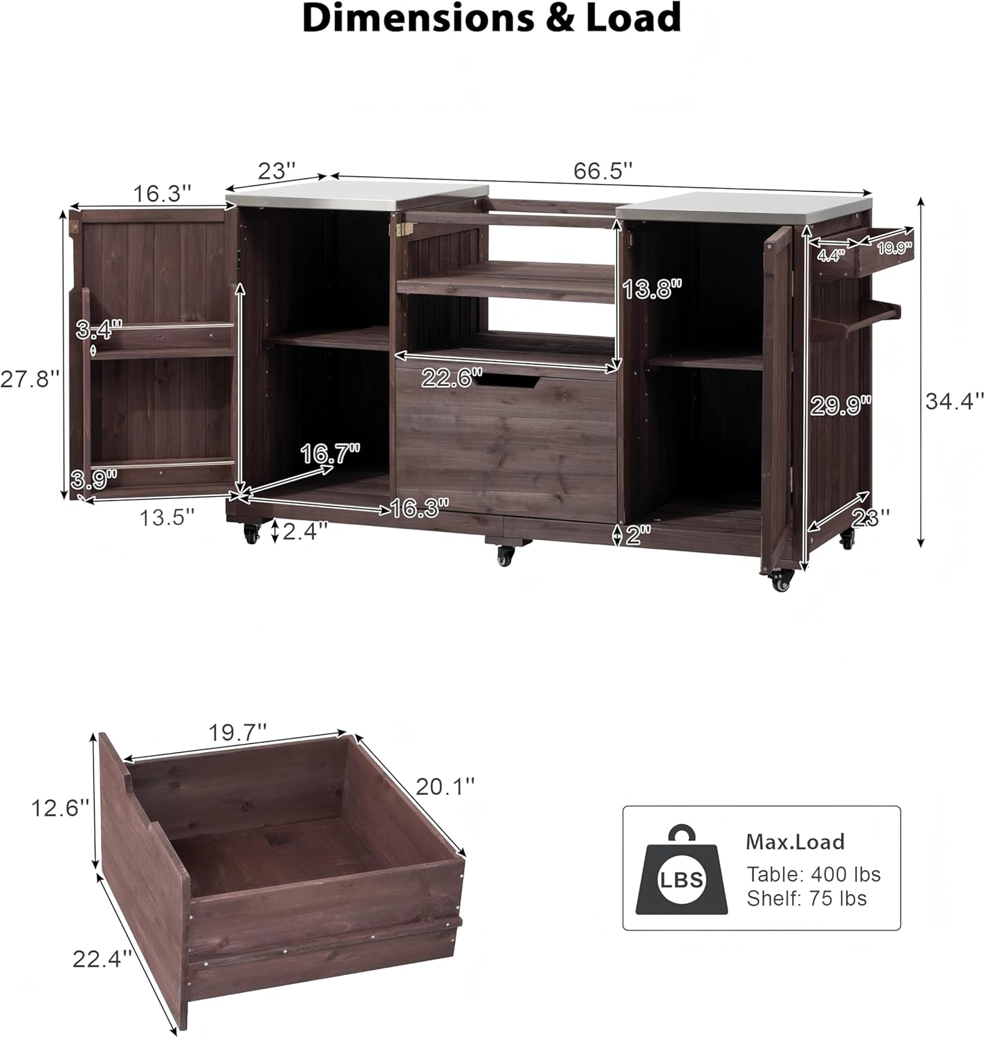 Merax 66.5" Outdoor Grill Table for Big Green Egg, Farmhouse Kitchen Island on Wheels with Stainless Steel Tabletop, Drawer and Spice Rack, Solid Wood Outdoor Storage Cabinet for Backyard, Dark Brown