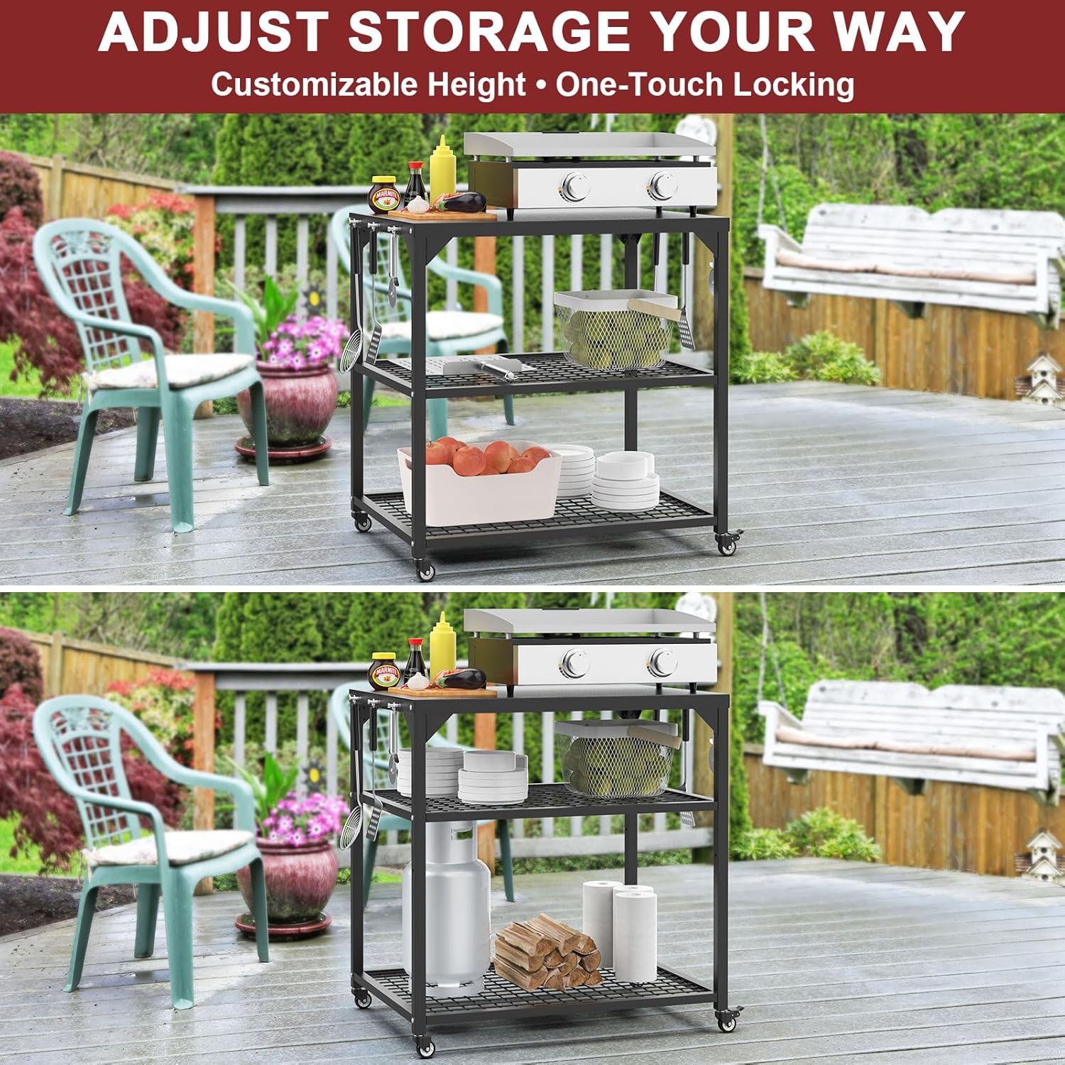 - 360° Mobility with Lockable Wheels: The four 360° rotating wheels make it easy to move the cart to any location, while two lockable wheels ensure stability when in use. Whether you’re shifting the cart across the patio or securing it for cooking, this design ensures a stable and safe work environment