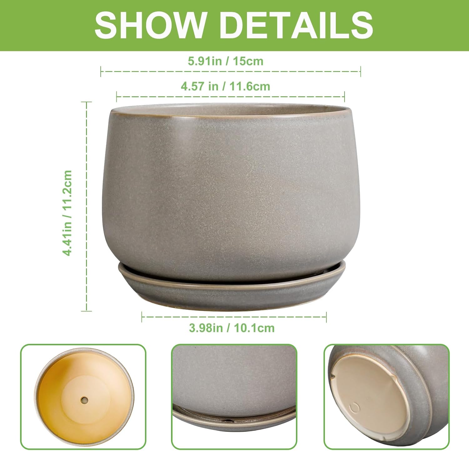 - Dimensions: These ceramic flower pots pit measures 5.91" x 5.91" x 4.41". This retro gray planter is an ideal choice for growing succulent plants, cacti, aloe vera, orchids, snake plant, african violet and other indoor & outdoor plants