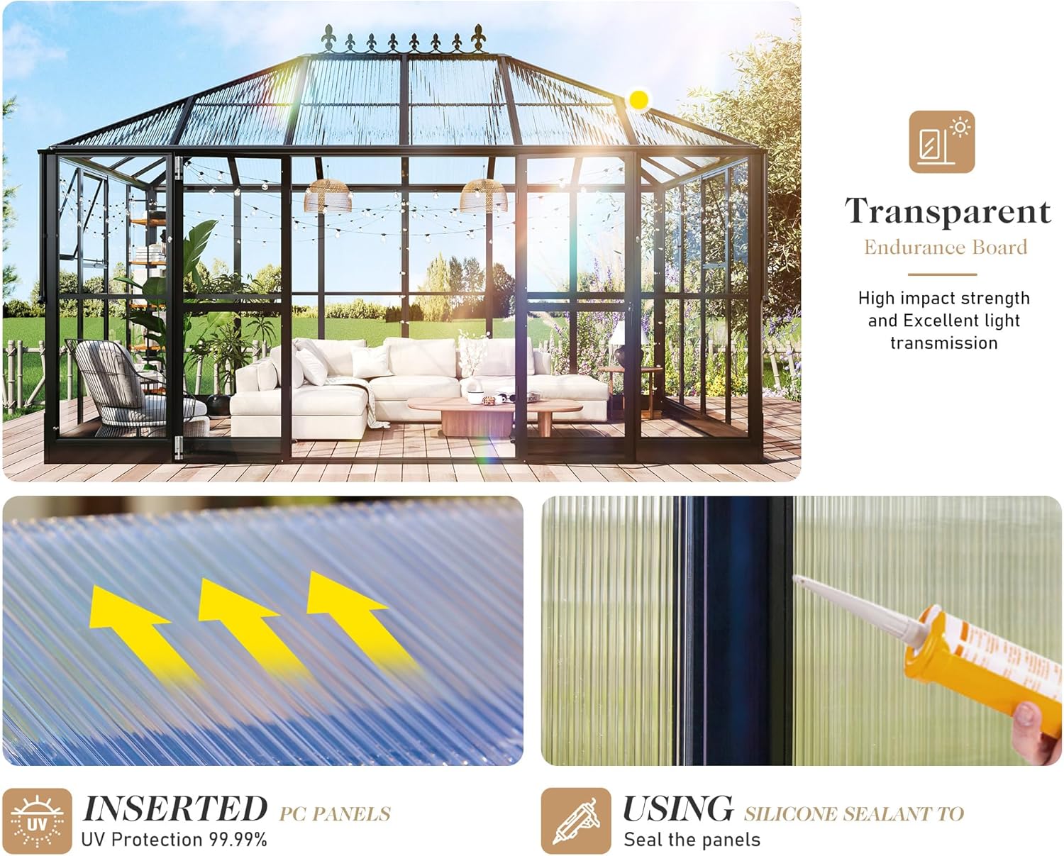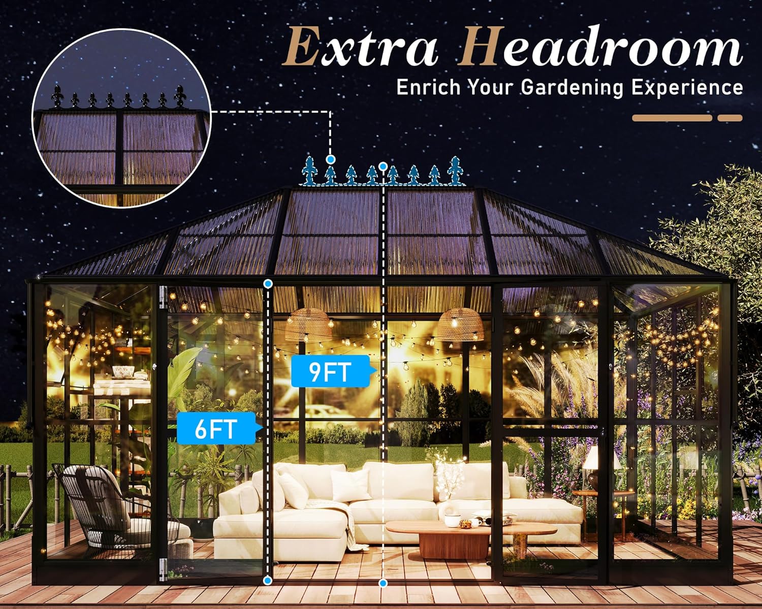HOWE 14x9.5x9 FT Pavilion Styled Greenhouse with Clear Panels Double Swing Doors, 6 FT Wall Height Hybrid Polycarbonate Greenhouse, Green Houses for Outdoors, Sunroom Black