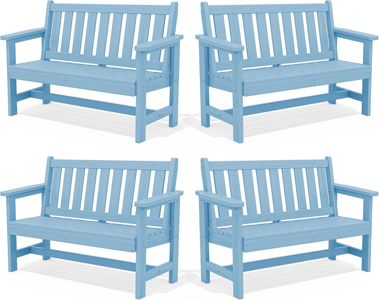 SERWALL Outdoor Bench, HDPE Outdoor Benches Weatherproof, 2-Person Garden Bench with 660 lbs Weight Capacity, Patio Benches for Outdoors, Garden, Porch, Backyard and Park, Light Blue, 4 Pack