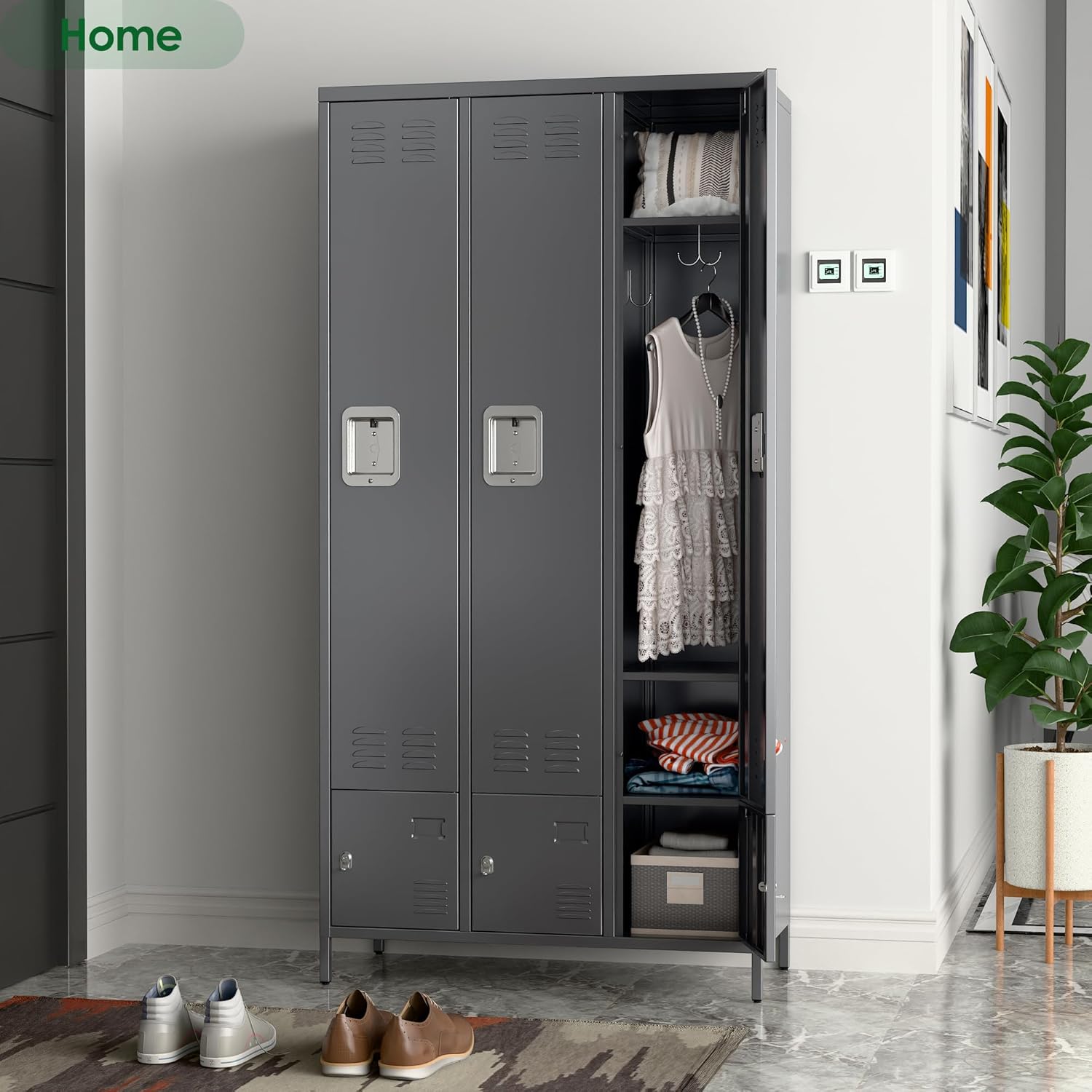 - 【Unique Design】Steel locker with 6 doors are equipped with ventilation holes,which help you keep items dry and ventilated, eliminating odor and moisture.Three large metal locker with plenty of room to store your stuff. Three small locker underneath for storing shoes and other items.