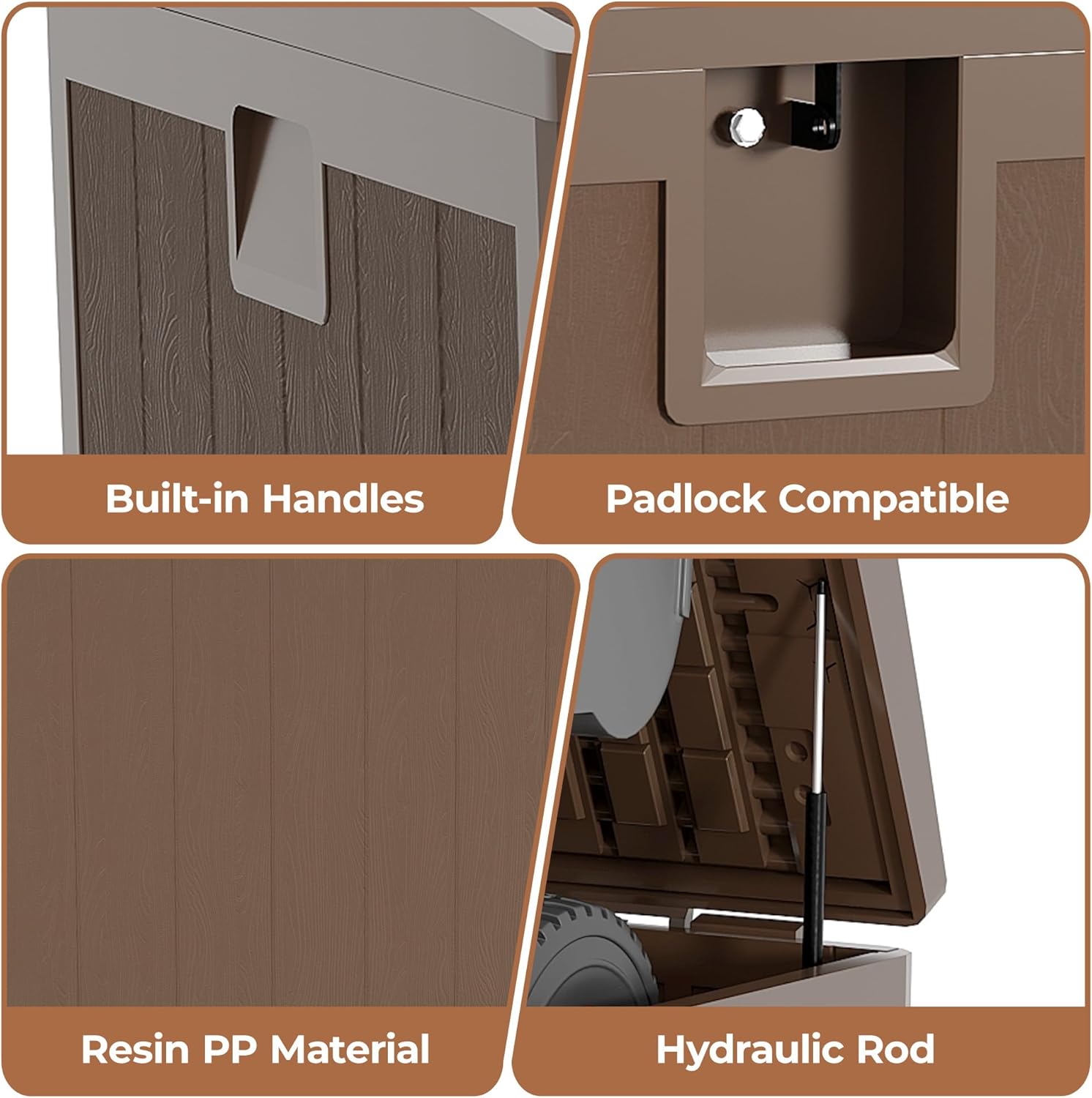 - Unrivaled All-Weather Resilience: This resin deck box is engineered with an all encompassing all-weather design. Its surface showcases an aggregate resin finish paired with a charming wood grain pattern. This isn't just about good looks; this combination is a masterstroke of functionality. It acts as a formidable shield against water, UV radiation, color fading, rust formation, surface peeling, and material warping. Thanks to these robust features, it demands minimal upkeep over the years. Wheth