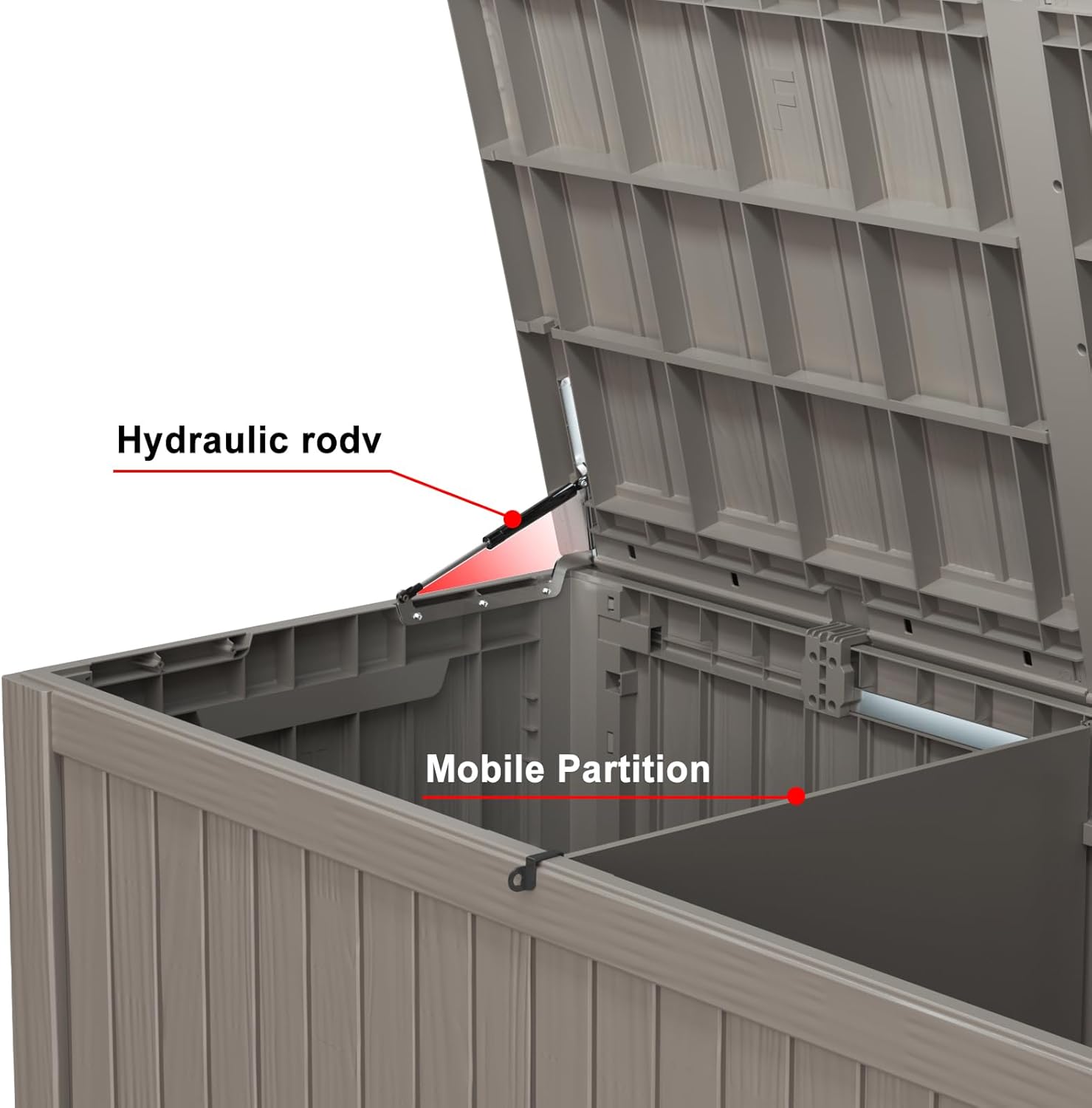 - Hydraulic Support for Easy Lid Opening:Equipped with hydraulic support, this deck box lid opens smoothly and stays open, providing easy access to your stored items. No need to struggle with heavy lids anymore.