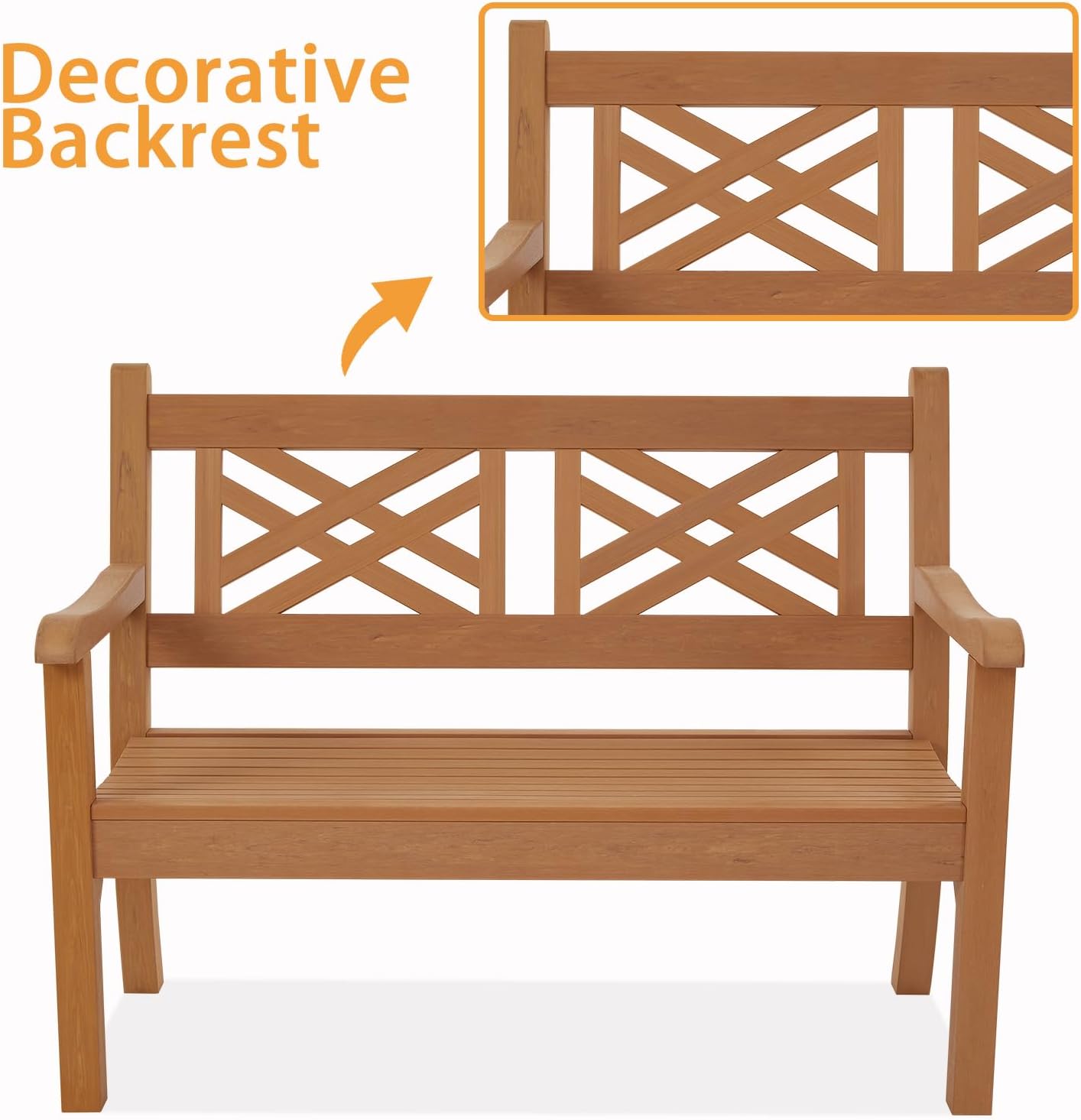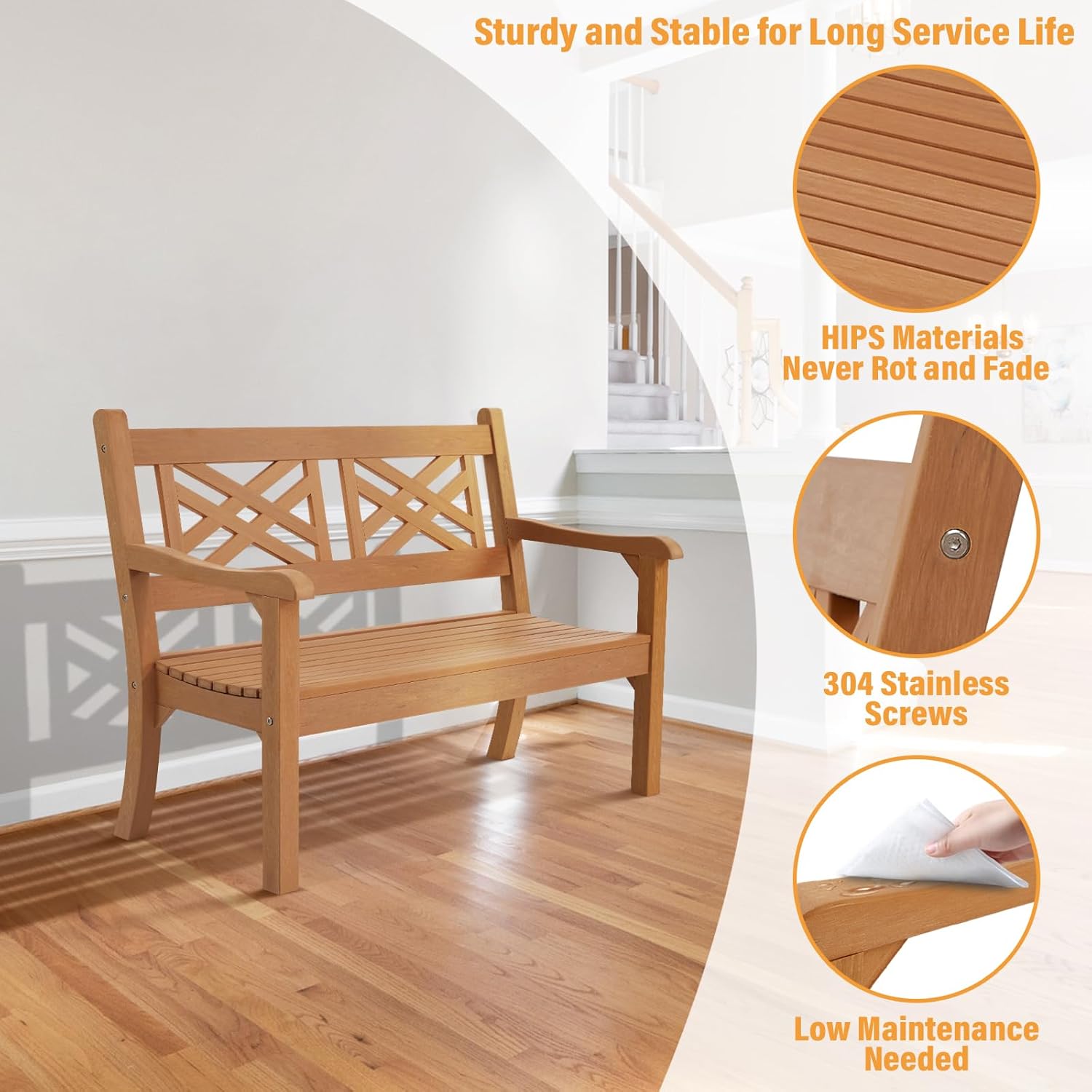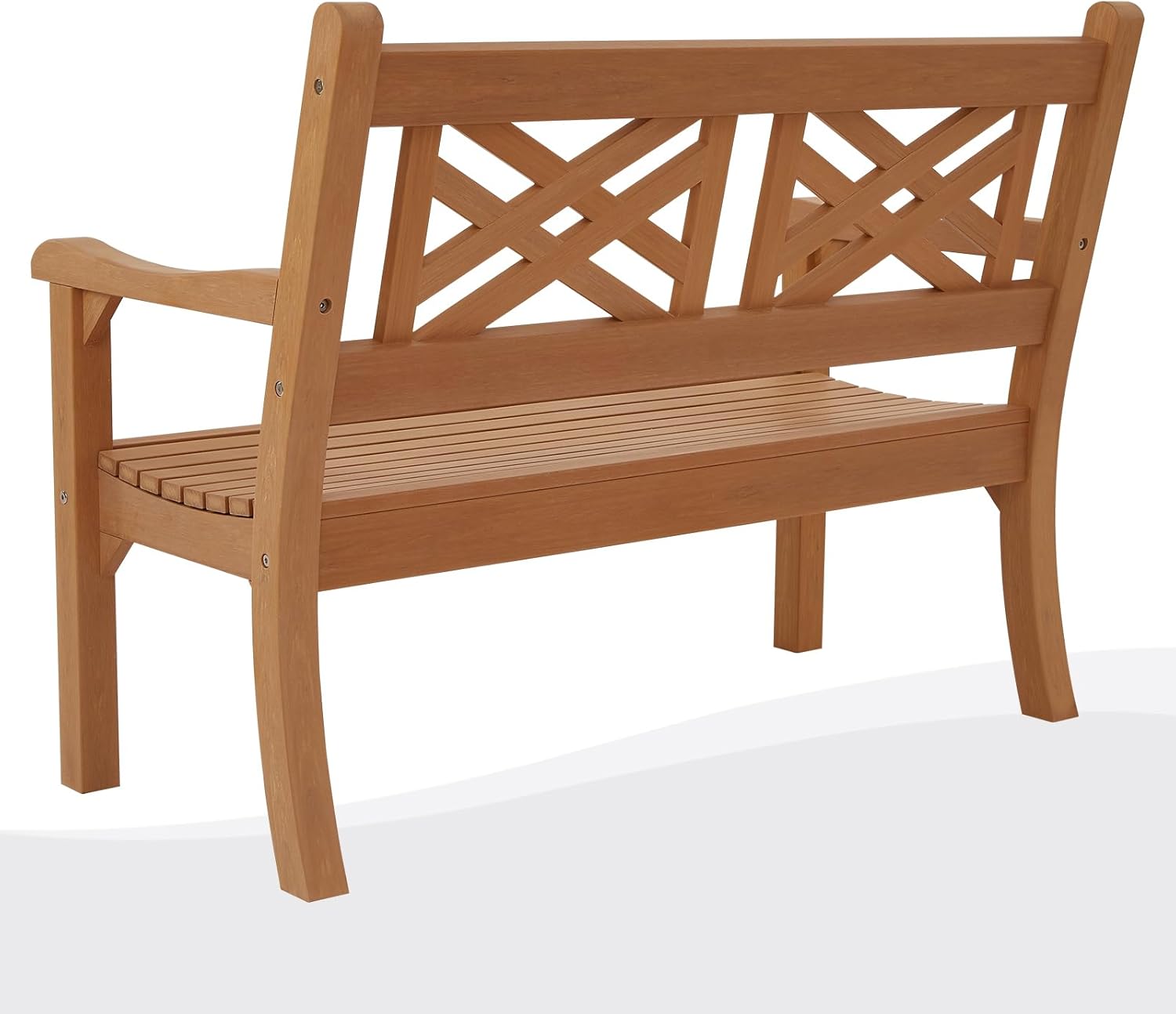 Psilvam 49''W All-Weather Poly Lumber Outdoor Bench – Grey, 2-Person Garden Bench with Decorative Backrest & Curved Armrests, Anti-Fade Patio Bench for Porch, Backyard, and Park(Teak Color)