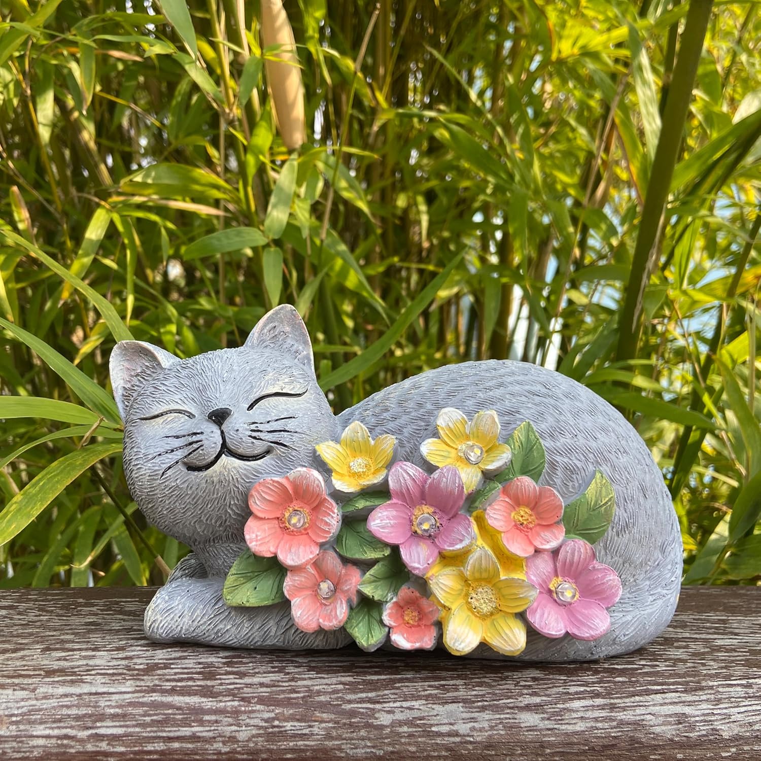 - Perfect Size: The solar cat light is handmade with vivid and cute facial expression, lifelike fur texture, and colorful flowers around the resting cat. The LED cat statue measures 7.5’’Lx3.74’’Wx4.5’’H, great embellishment for indoor home decor and outdoor garden and patio decor