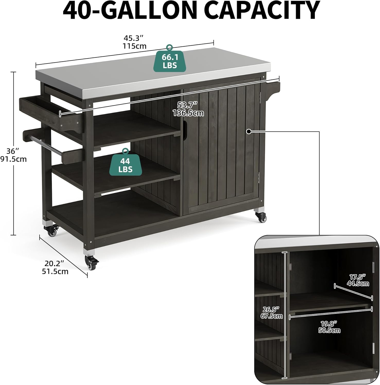 - Multipurpose Functionality: With spice racks, a towel rack, and a magnetic door design that keeps small animals out, this grill cart is a versatile solution. Use it as a kitchen island, outdoor kitchen, storage cabinet, or grill cart