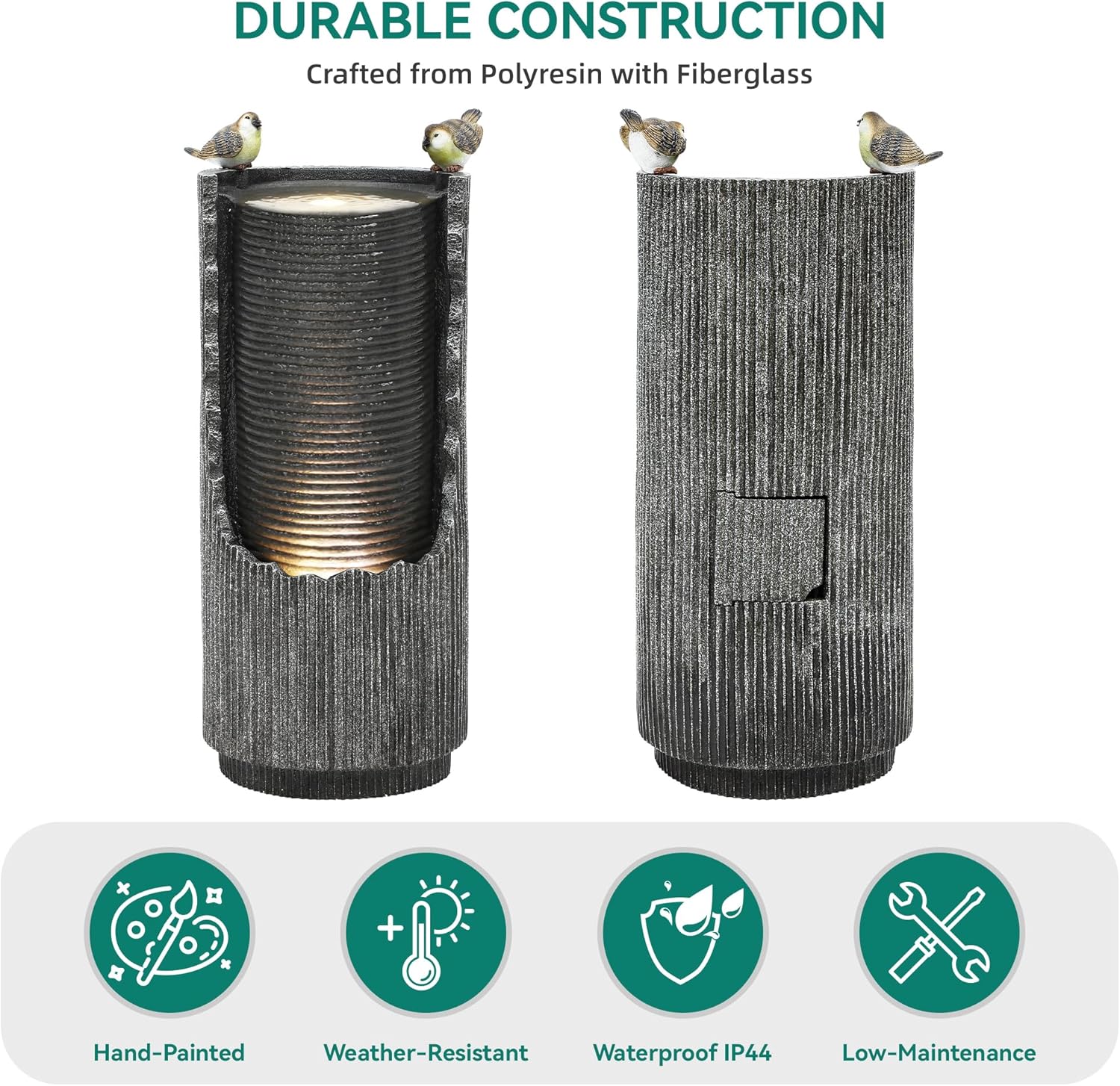 - RUSTIC JAR OUTDOOR FOUNTAIN: Our Modern Column Outdoor Fountain features a one-of-a-kind design. It combines handcrafted 3D concrete textures, rustic details, and charming bird accents. Measuring 14.96"L X 12.8"W X 31.89"H, this Outdoor Resin Fountain seamlessly blends modern aesthetics with natural charm, making it a perfect addition to any outdoor space.