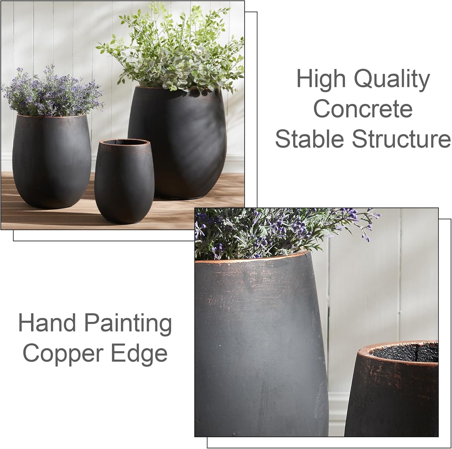 15.5" H Outdoor Concrete Planter, Round Flower Pot with Drainage Hole and Silicone Plug, Plant Container for Garden, Patio, Home, Office, Black, Copper Rim, 1 Pack