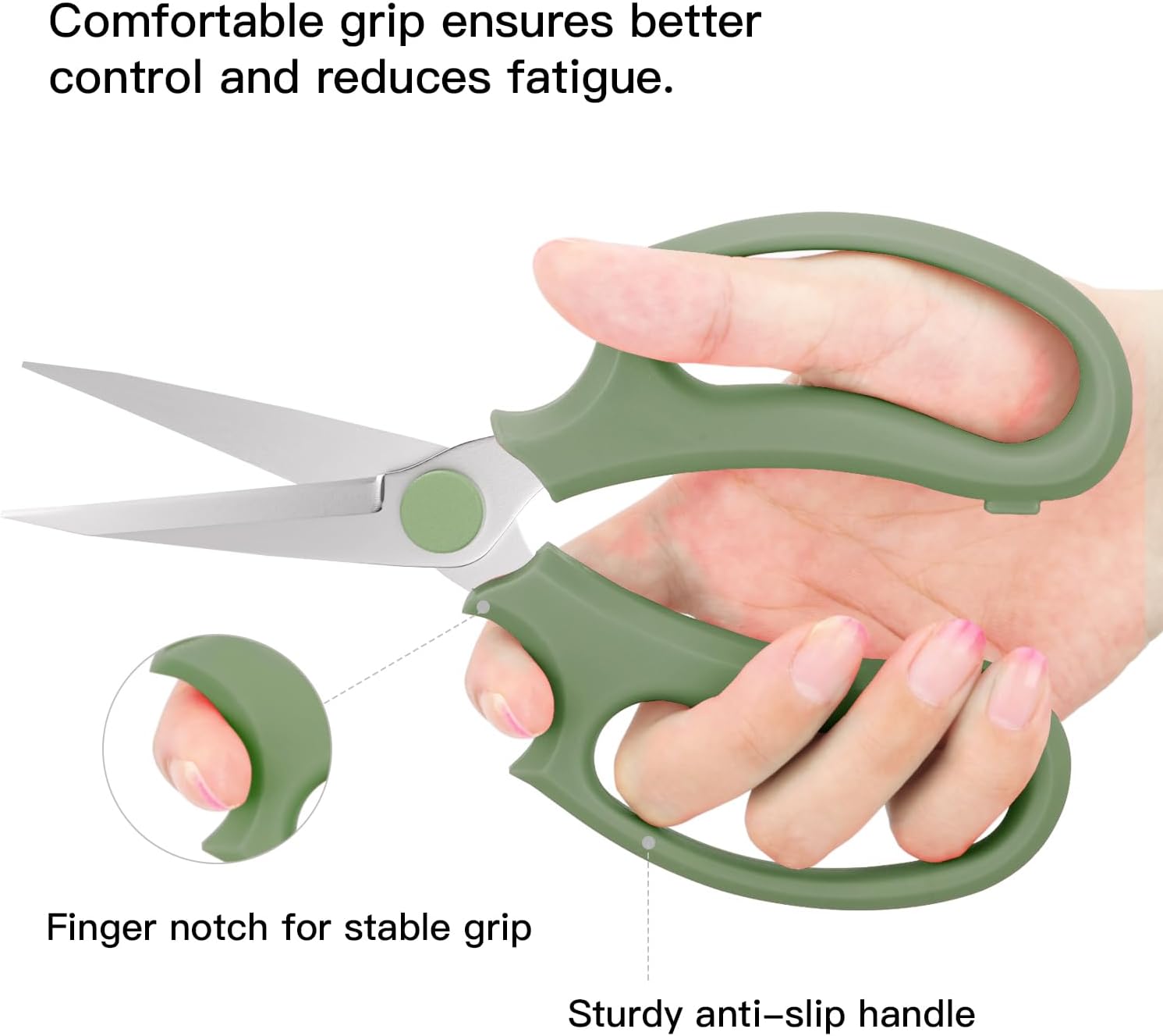 - ERGONOMIC HANDLE: The handle adopted non-slip PP material, durable yet soft; The ergonomic handle with groove design, which is portable and lightweight, let you comfortable to grip; The delicate appearance will the shear looks rather functional and stylish.