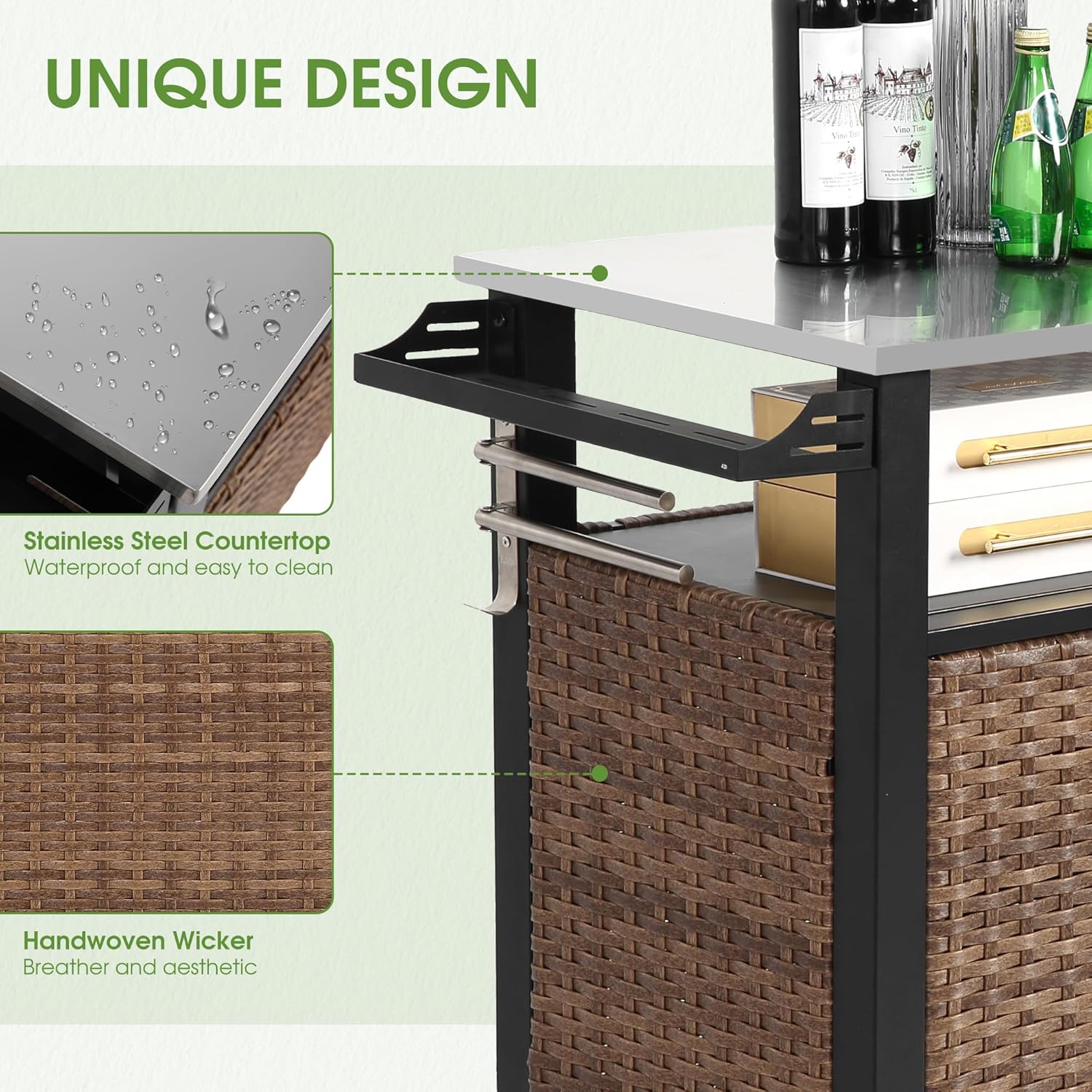 HOMEFUN Kitchen Island Cart Wicker Grill Prep Station & Stainless Steel Outdoor Serving Bar Table with Hooks Wheels Poolside Patio Grassland (Large)