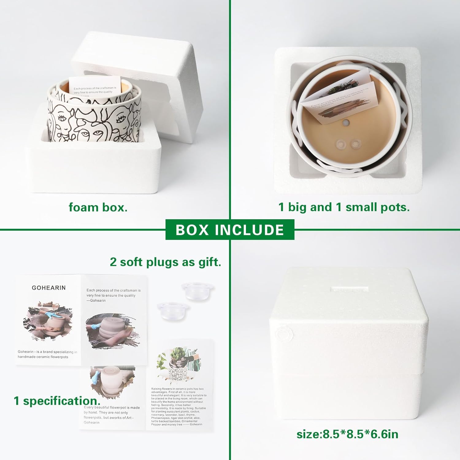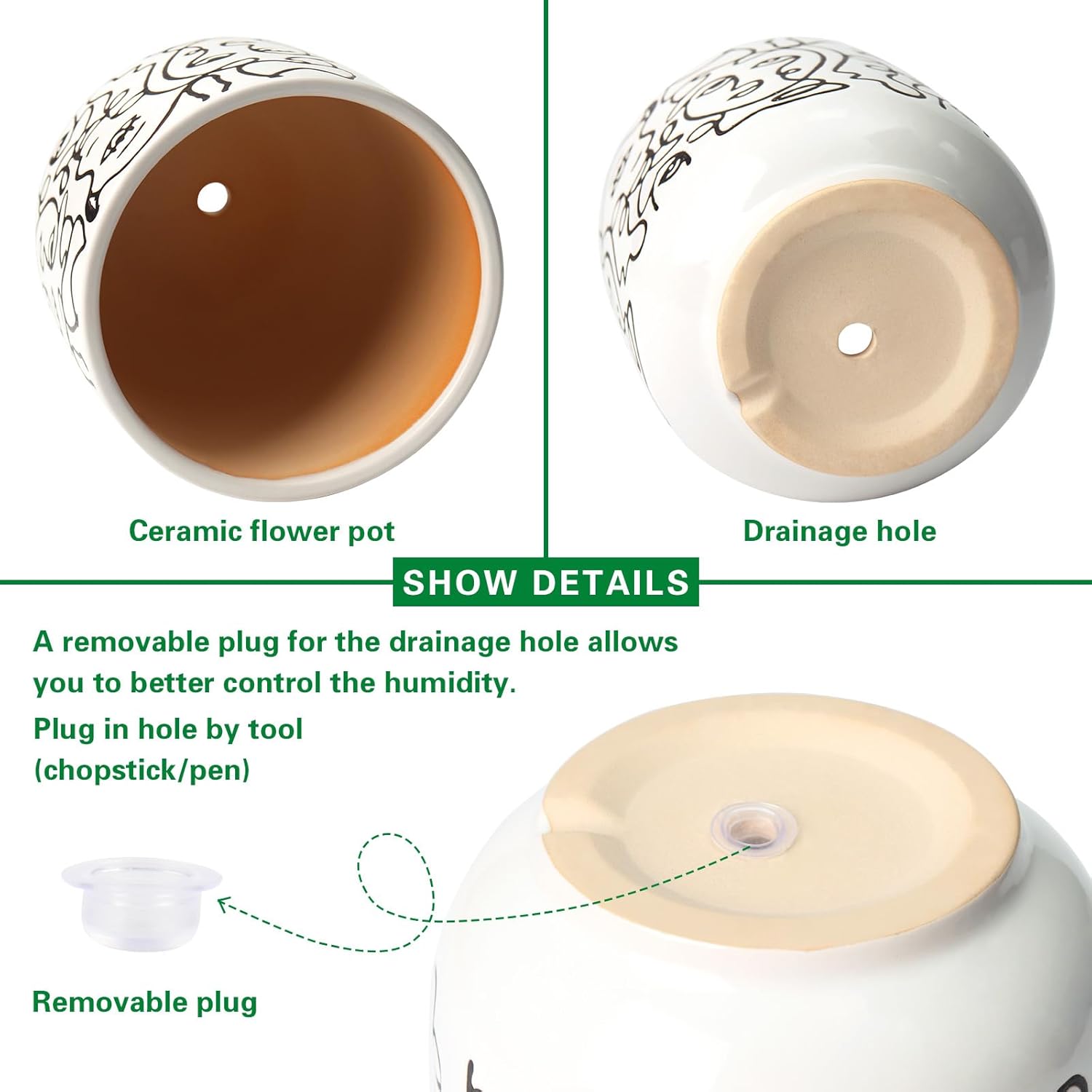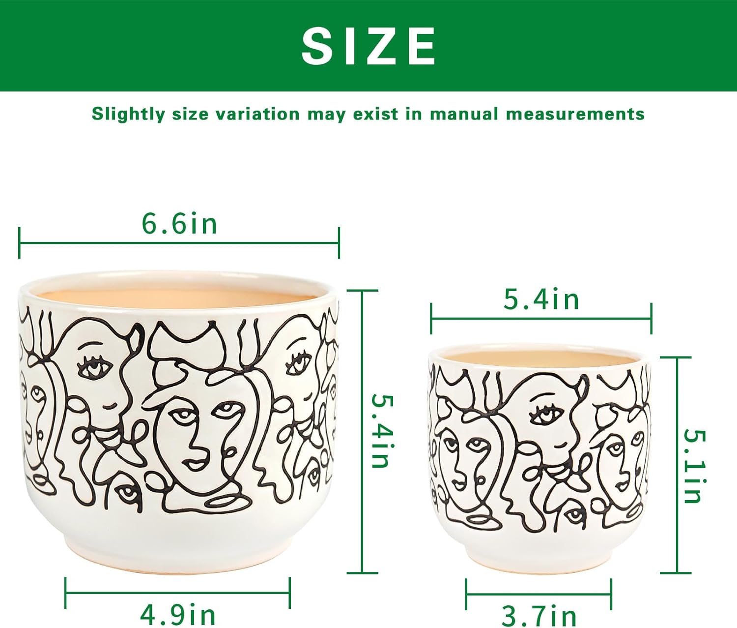 Docrin Plant Pots Indoor with Drainage : 6.6+5.4 Inch Ceramic Flower Pots for Plants - Set of 2 Modern Decorative Face Planters for House/Office/Gift - /Black and White