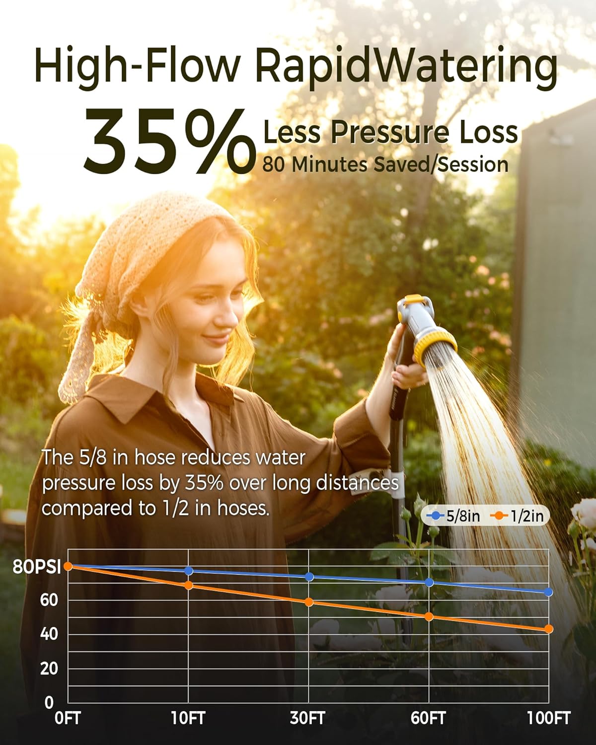 - High-Flow Rapid Watering: The 5/8 in x 100 ft hose on this retractable hose reel reduces water pressure loss by 35% over long distances compared to 1/2 in hoses, saving 80 minutes per session for irrigating basketball court-sized gardens. Ideal for large-scale, high-efficiency tasks