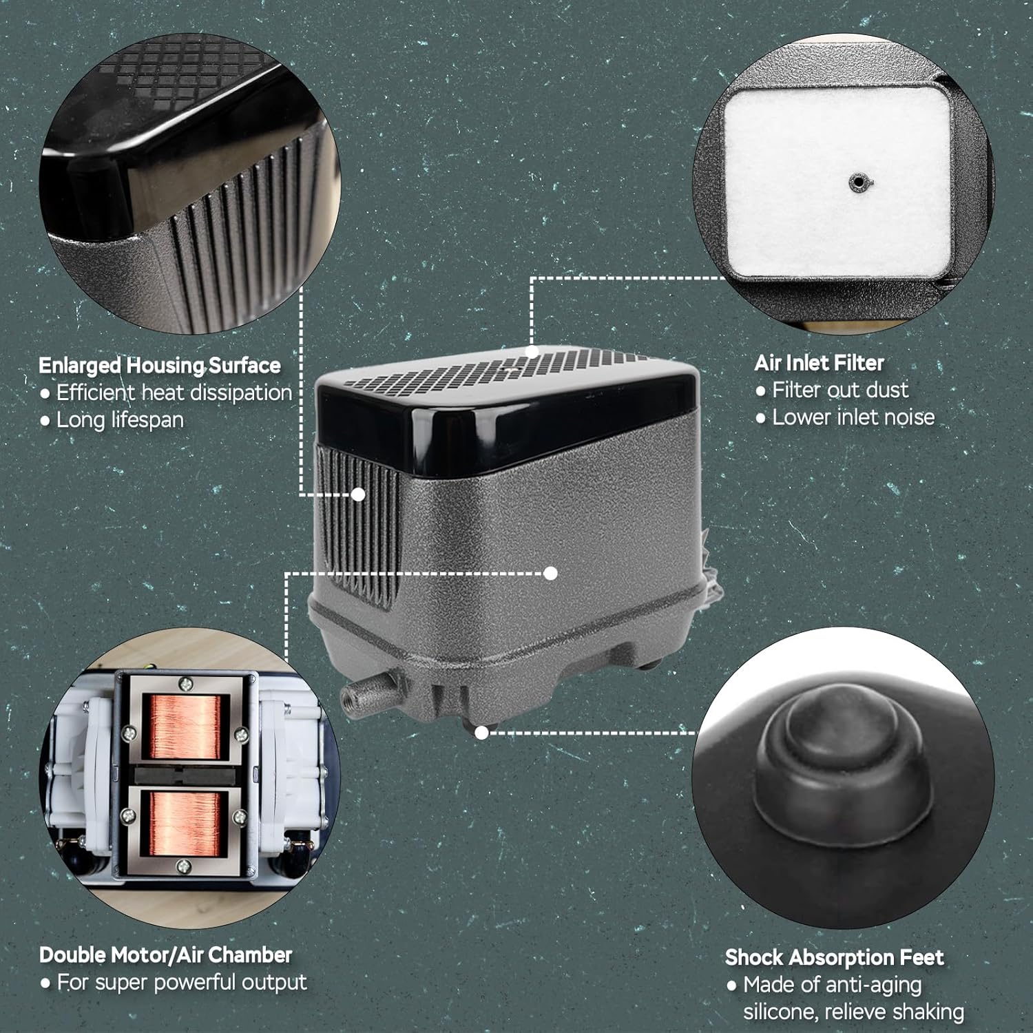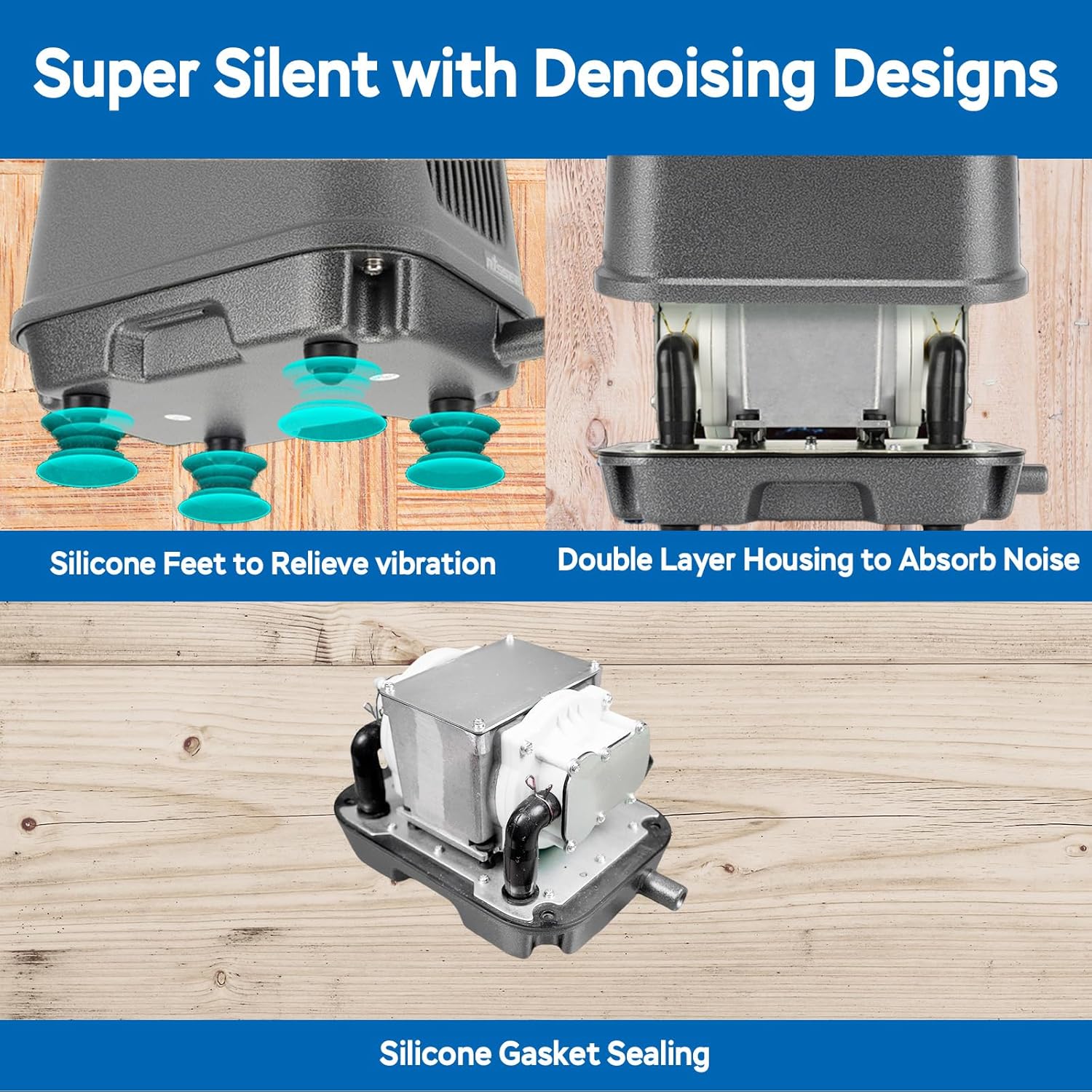 - QUIET - Our linear air pump experiences near-silent performance thanks to our multi-layer noise reduction system: double-layered housing, vibration-absorbing silicone feet, and precision silicone gasket sealing.