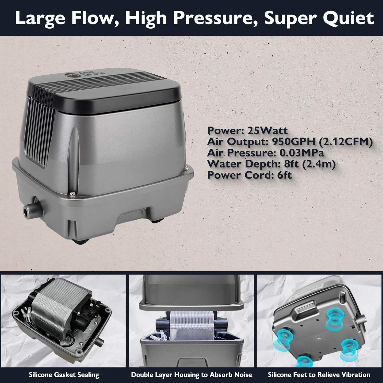 - SUPER SILENT - This koi pond aerator is very quiet with the unique motor design, the straight airflow path and the vibration-relieving rubber feet.