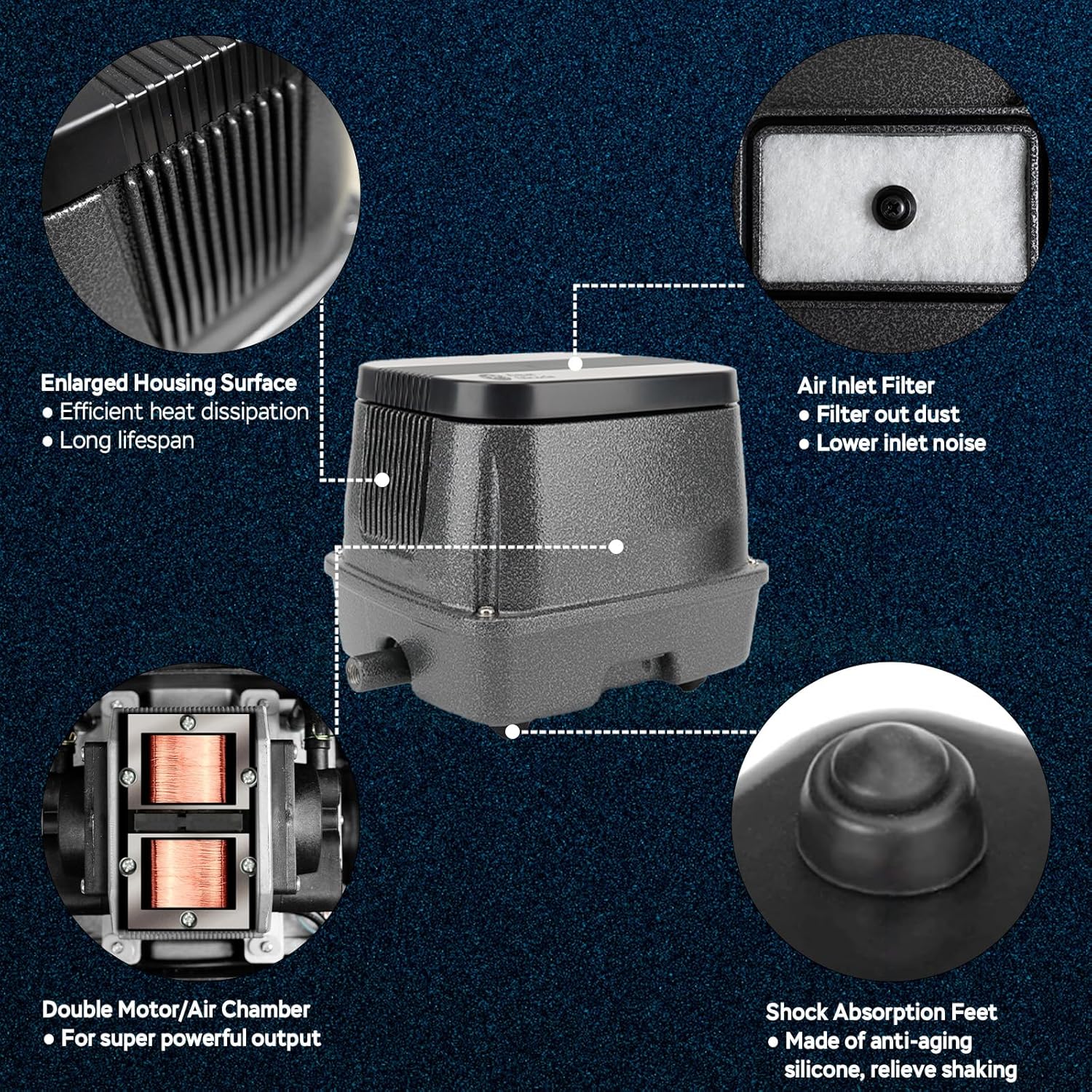 - SPECIFICATION - This linear air pump delivers a max of 1600GPH powerful airflow at 0.035MPa pressure with an 60W energy-efficient copper coil motor that runs in stable operation and lasts longer. Perfect as a pond aerator, septic aerator, hydroponic air pump, or aquarium air pump, it provides high efficiency, low heat and low power consumption.