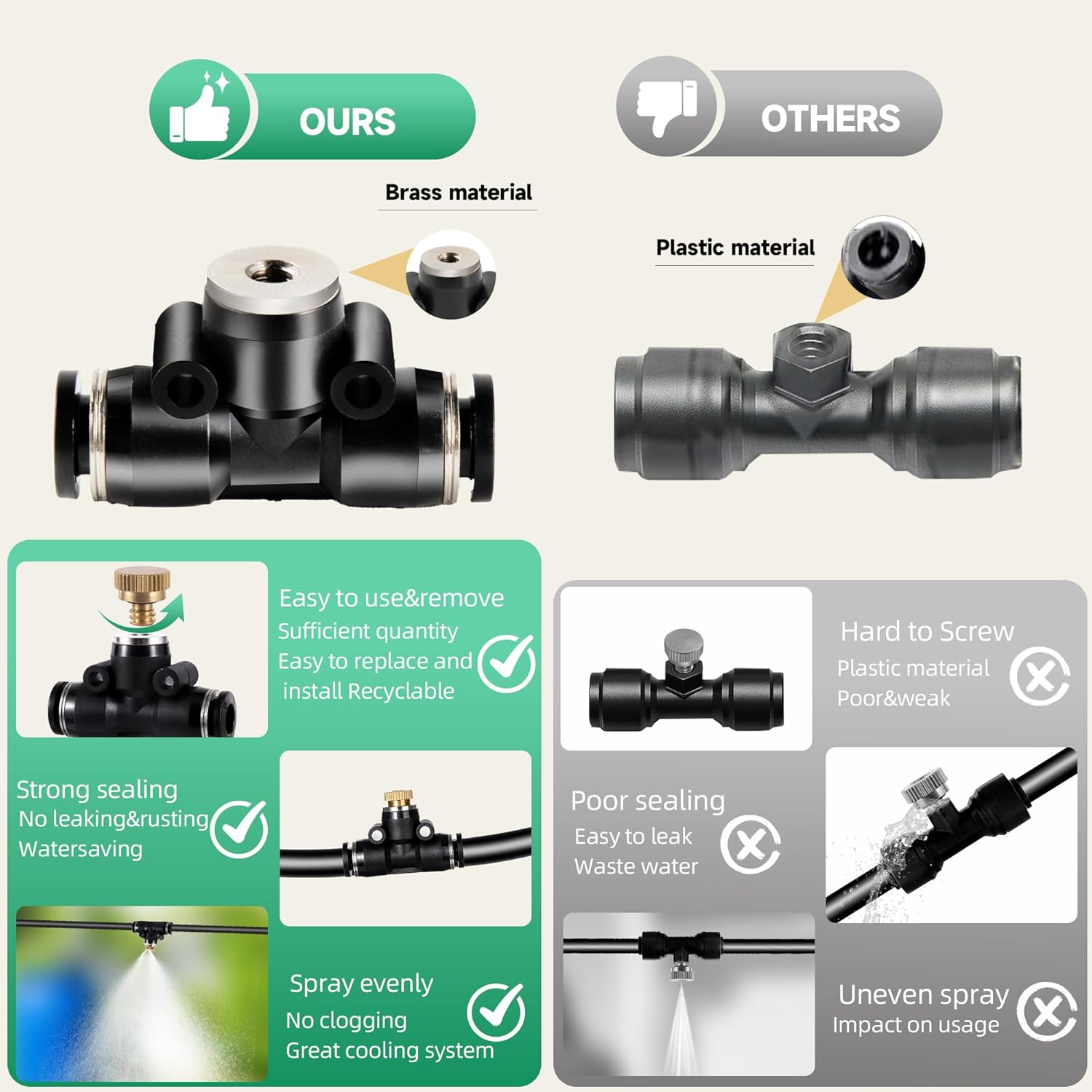 - ANTI LEAK & WATER SAVING: Brass Misting Nozzles and Irrigation Fittings are crafted from premium brass and rust-proof plastic, ensuring strong sealing and preventing leaks. They are easy to install and significantly reduce water wastage. (According to NFAMRZCAR laboratory testing, WATER SAVING CAN REACH UP TO 95%.) This perfect outdoor misting system for cooling makes a substantial difference in temperature