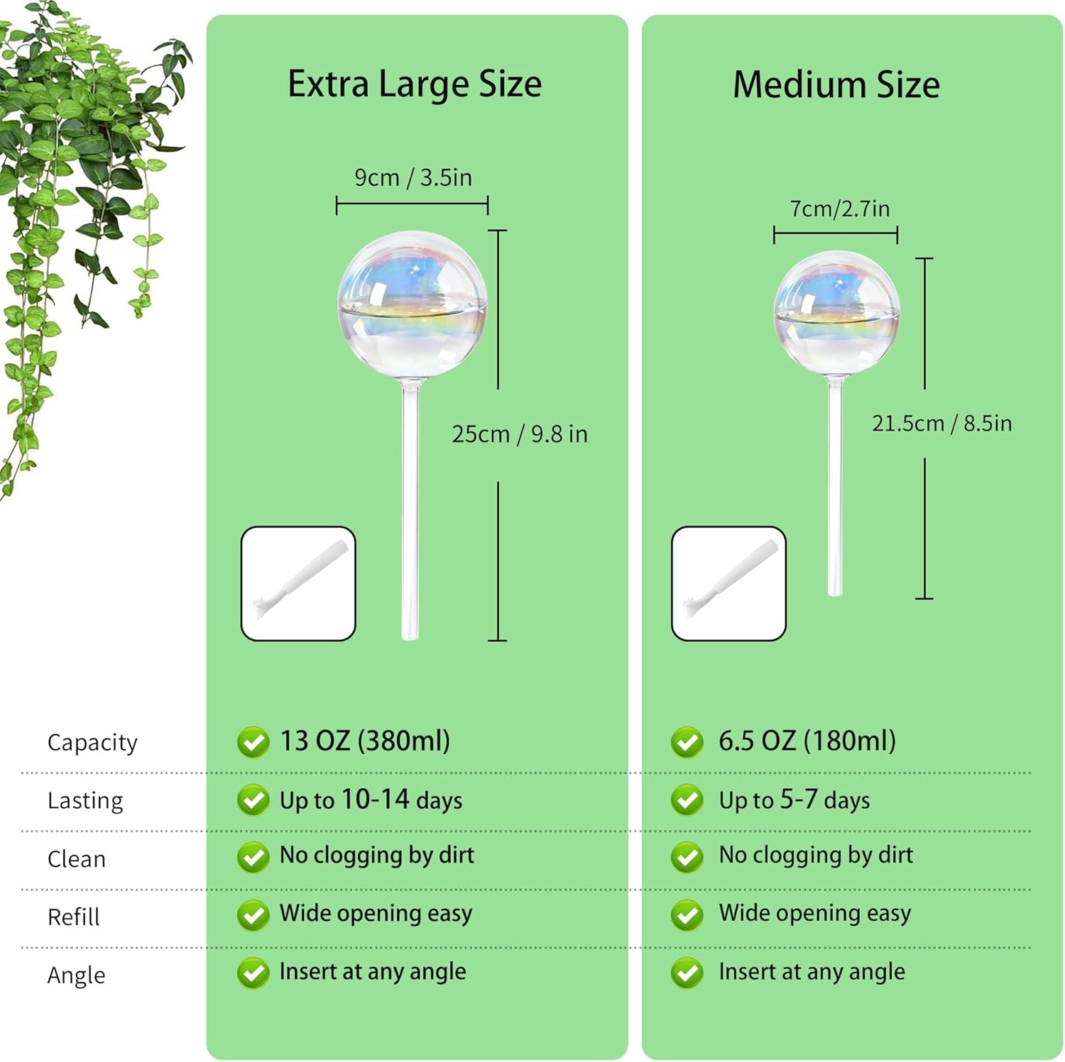 - 💧 Large 13oz Capacity These self-watering bulbs provide up to 2 weeks of hydration, ideal for larger plants. Best suited for pots 4 inches and above.