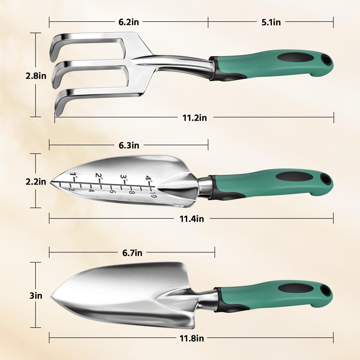 - 【All-in-One Gardening Kit】This 3-piece set includes a trowel, transplanter, and cultivator, providing all the tools you need for planting, digging, and soil cultivation. Enjoy exceptional value and versatility solution that makes your gardening more enjoyable, and more efficient.