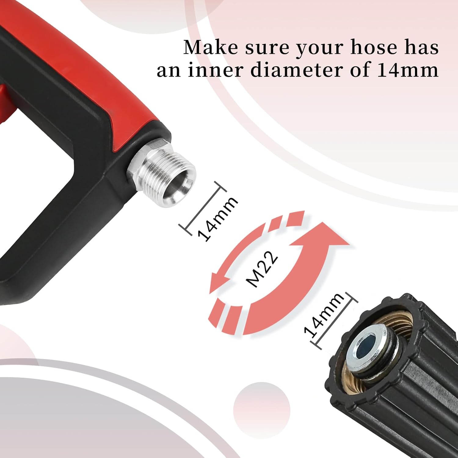 - 【Pressure Washer Gun】Sooprinse pressure washer gun specially designed for car wash enthusiasts, suitable for 4000 PSI high pressure washer. And the gun equipped with 1/4 quick connector, M22-14 connector. Suitable for most of the pressure washer.