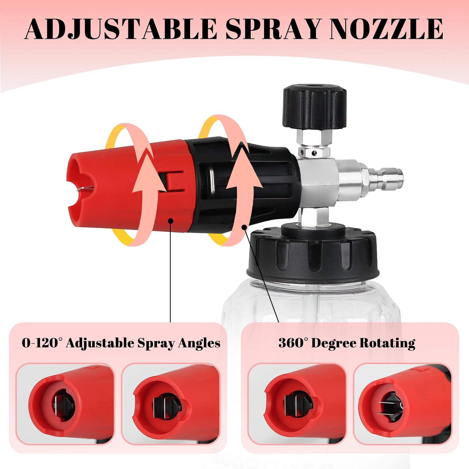 - 【Adjustable】Adjustable Foam Blaster for Pressure Washer: Adjust the spray nozzle to get a proper sprinkle pattern.Water regulator knob to control water and foam.Adjust the knob on the top to control water mix in.Turn the top knob right, minus (-) sign indicates less water (more foam), the (+) indicates more water (less foam). Front rotating adjustable nozzle to change jet pattern: water column and fan.